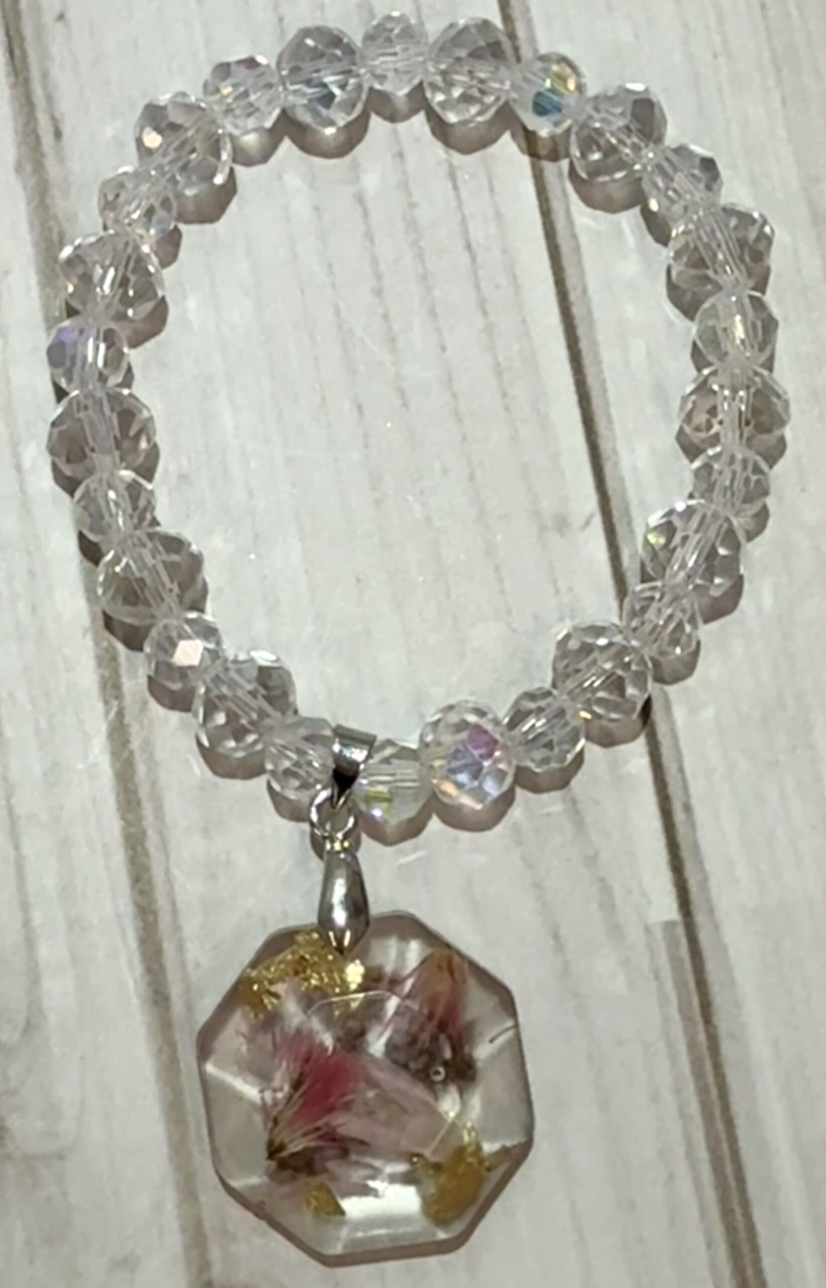 W centralnym punkcie znajduje się zawieszka z zatopionymi suszonymi płatkami kwiatów i złotymi drobinkami, które dodają całości romantycznego uroku i artystycznego charakteru.