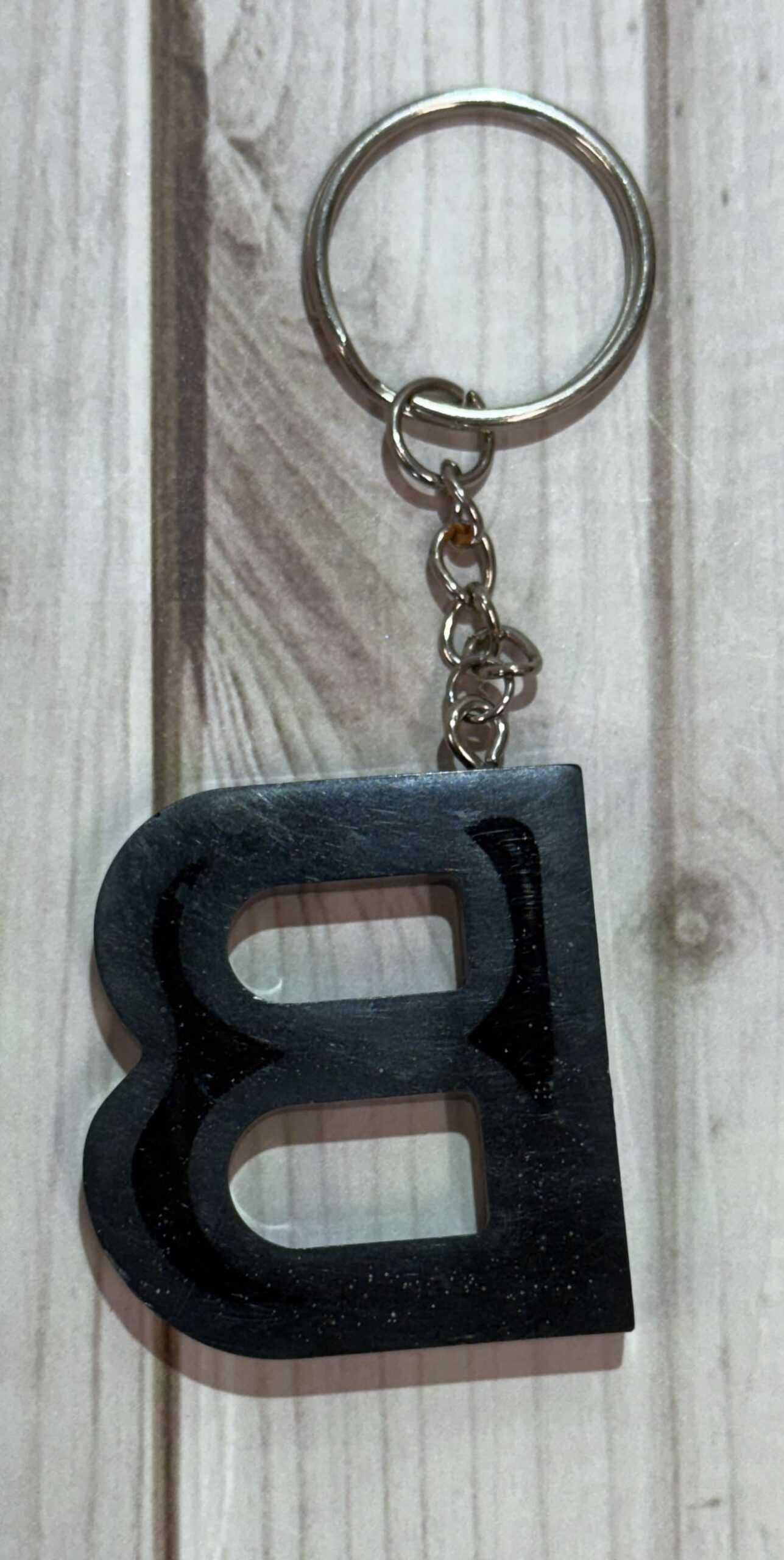 Elegancki brelok z literą B, wykonany z żywicy epoksydowej. Zawieszony na solidnym metalowym łańcuszku i kółeczku. Minimalistyczny, trwały i idealny do kluczy lub plecaka. Świetny jako drobny, personalizowany upominek.
