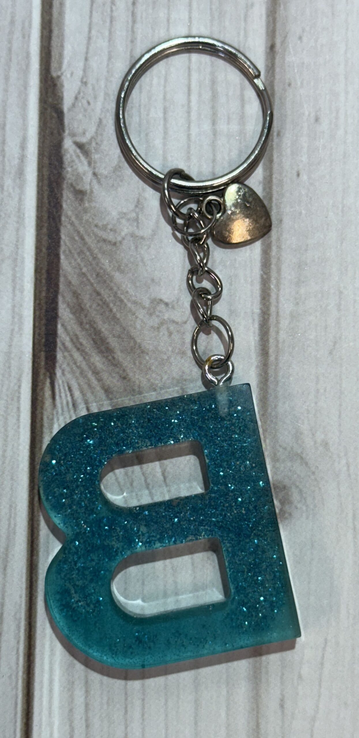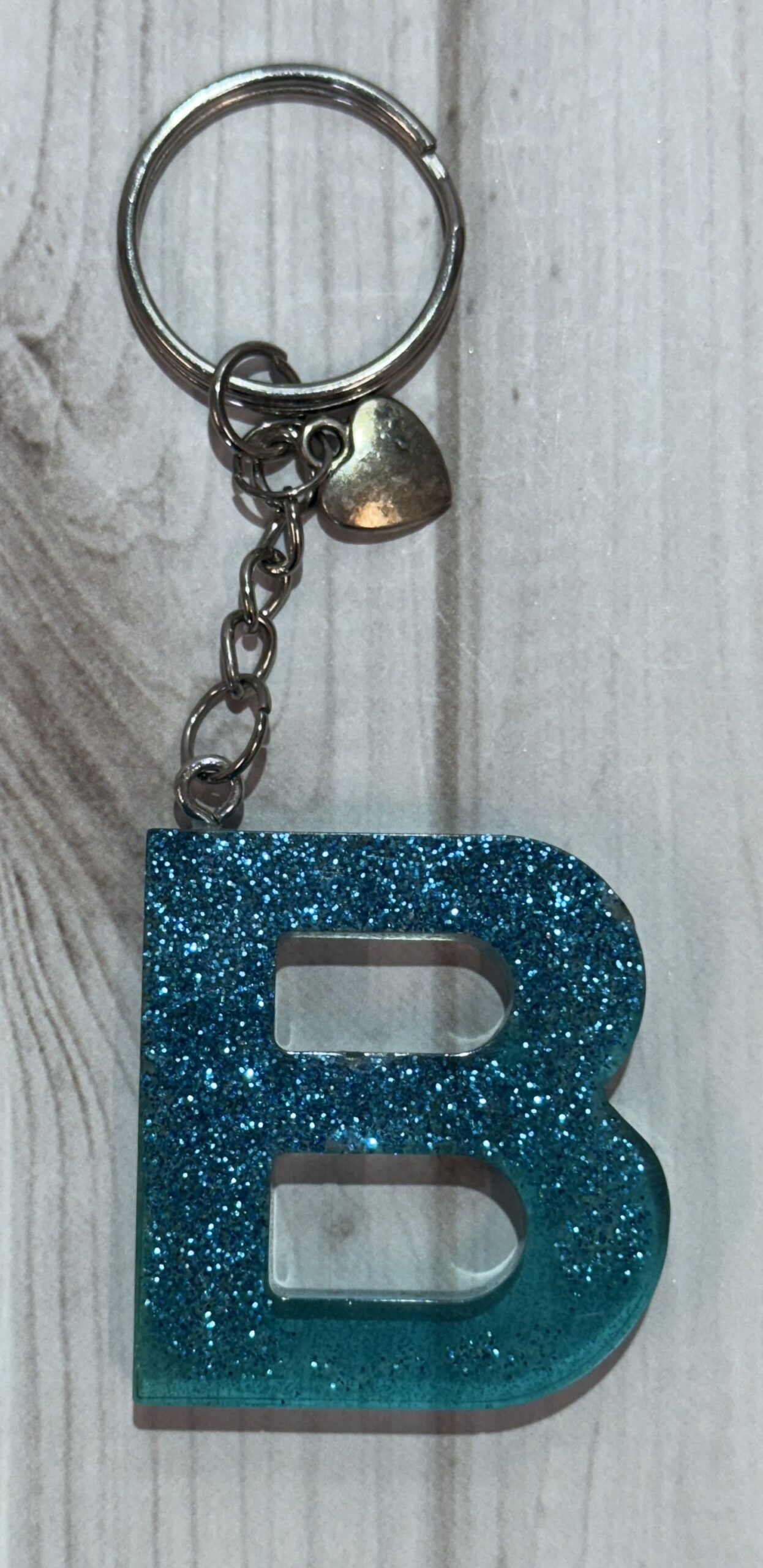 Efektowny brelok z literką B w transparentnym niebieskim kolorze, wypełniony drobniutkim, migoczącym brokatem. Połączony ze srebrnym kółkiem i uroczą zawieszką w kształcie serduszka. Lekki, połyskujący i idealny jako prezent lub stylowy dodatek do kluczy.