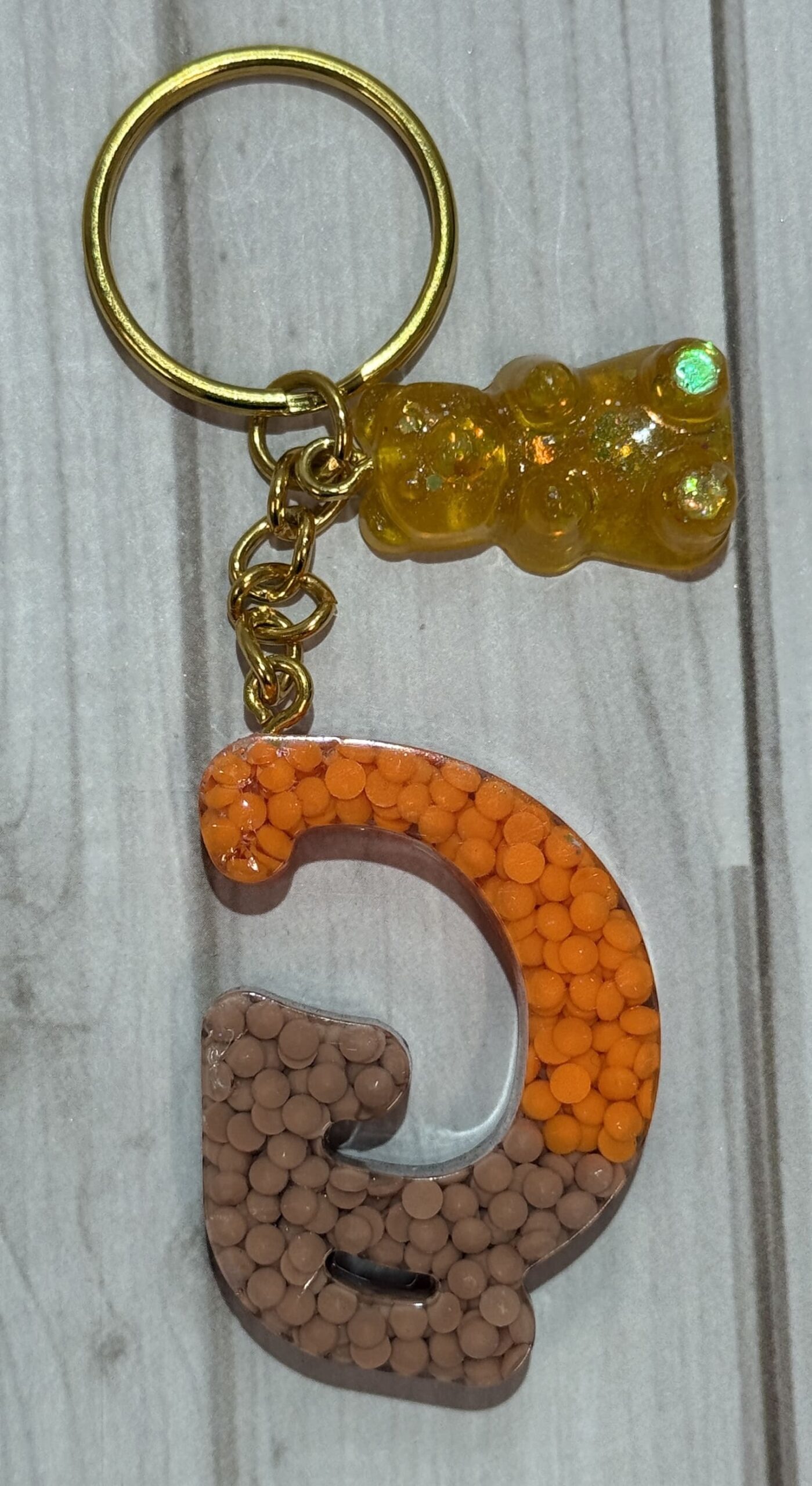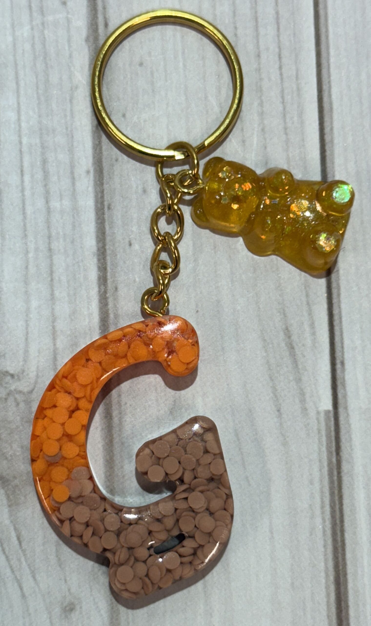 Ten wyjątkowy breloczek rozświetli każdy dzień! Litera G zdobiona drobnymi koralikami – u góry w ciepłym pomarańczowym, na dole w eleganckim brązowym – lśni subtelnym blaskiem. Urocza zawieszka w formie żółtego misia z brokatem dodaje całości słodkiego, magicznego uroku. Ręcznie wykonany z żywicy epoksydowej, idealny jako upominek lub wyjątkowy dodatek do kluczy, torebki czy plecaka.