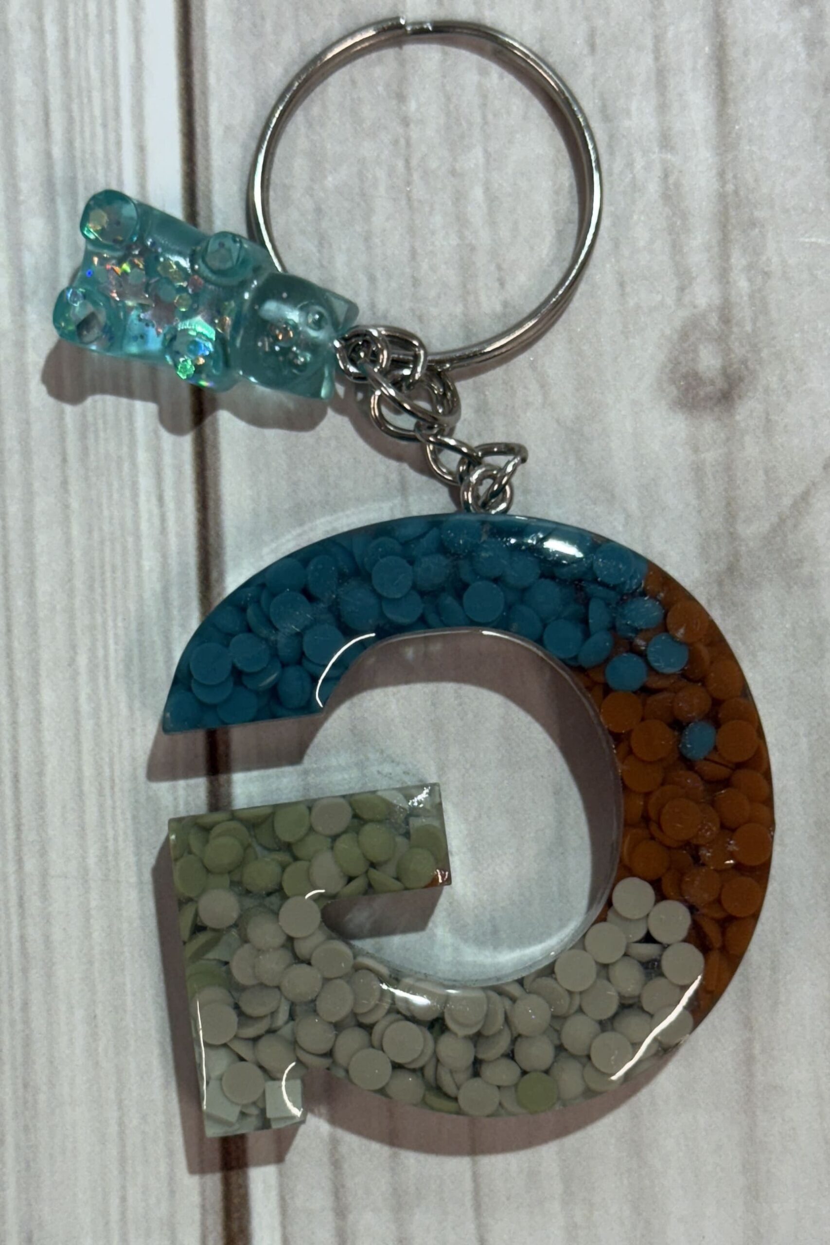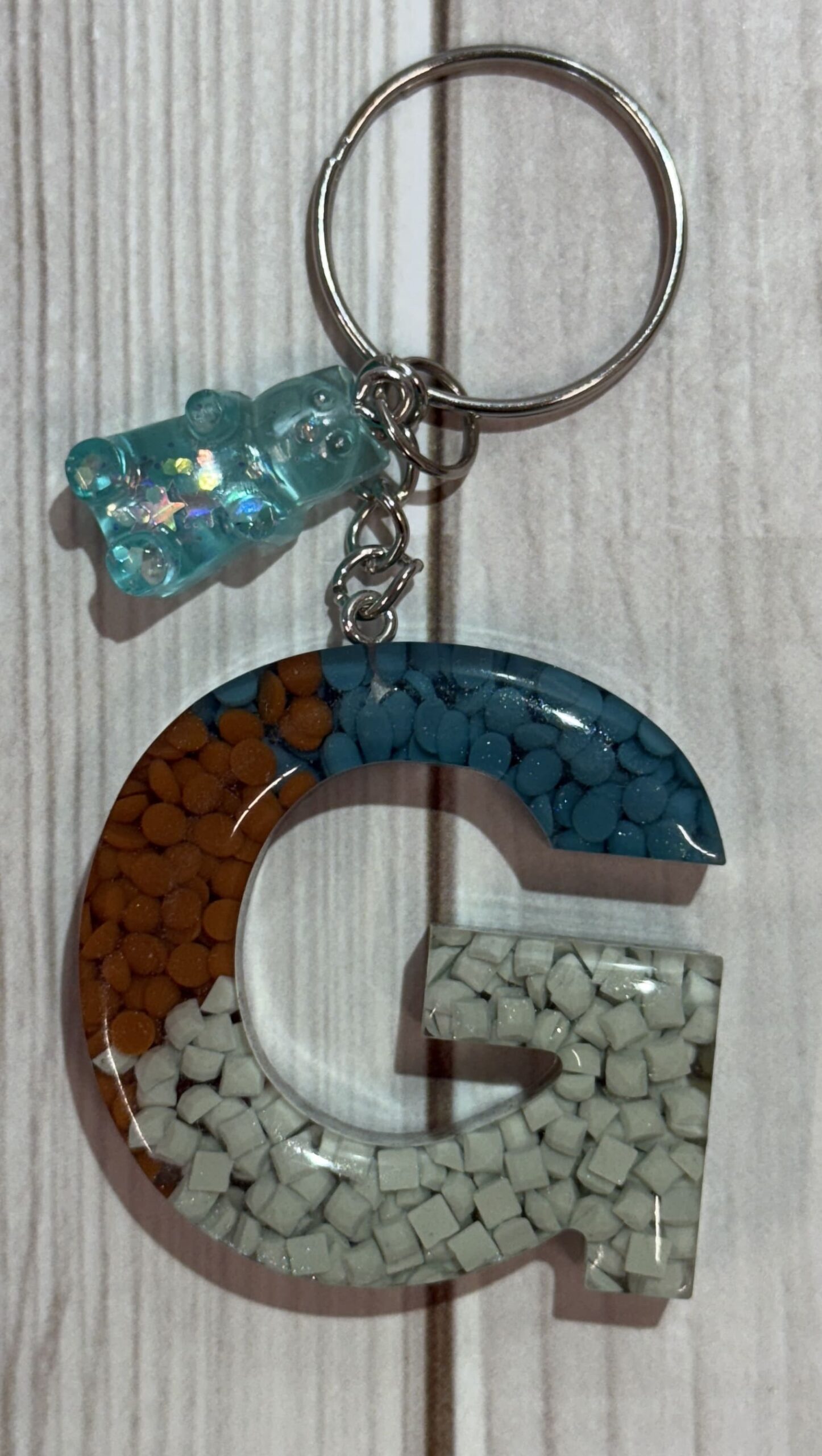 Breloczek z literą G wykonany z trójkolorowej mozaiki drobnych, matowych konfetti. Góra litery zachwyca głębokim granatem, środek wypełnia ciepły odcień brązu, a dół przechodzi w elegancki, stonowany szary. Do kompletu dołączony jest turkusowy żelkowy miś, mieniący się holograficznym brokatem, który dodaje całości lekkości i subtelnego blasku.