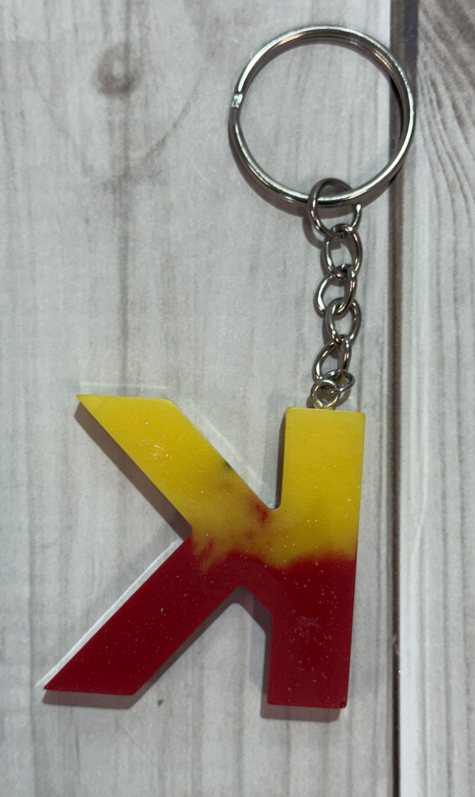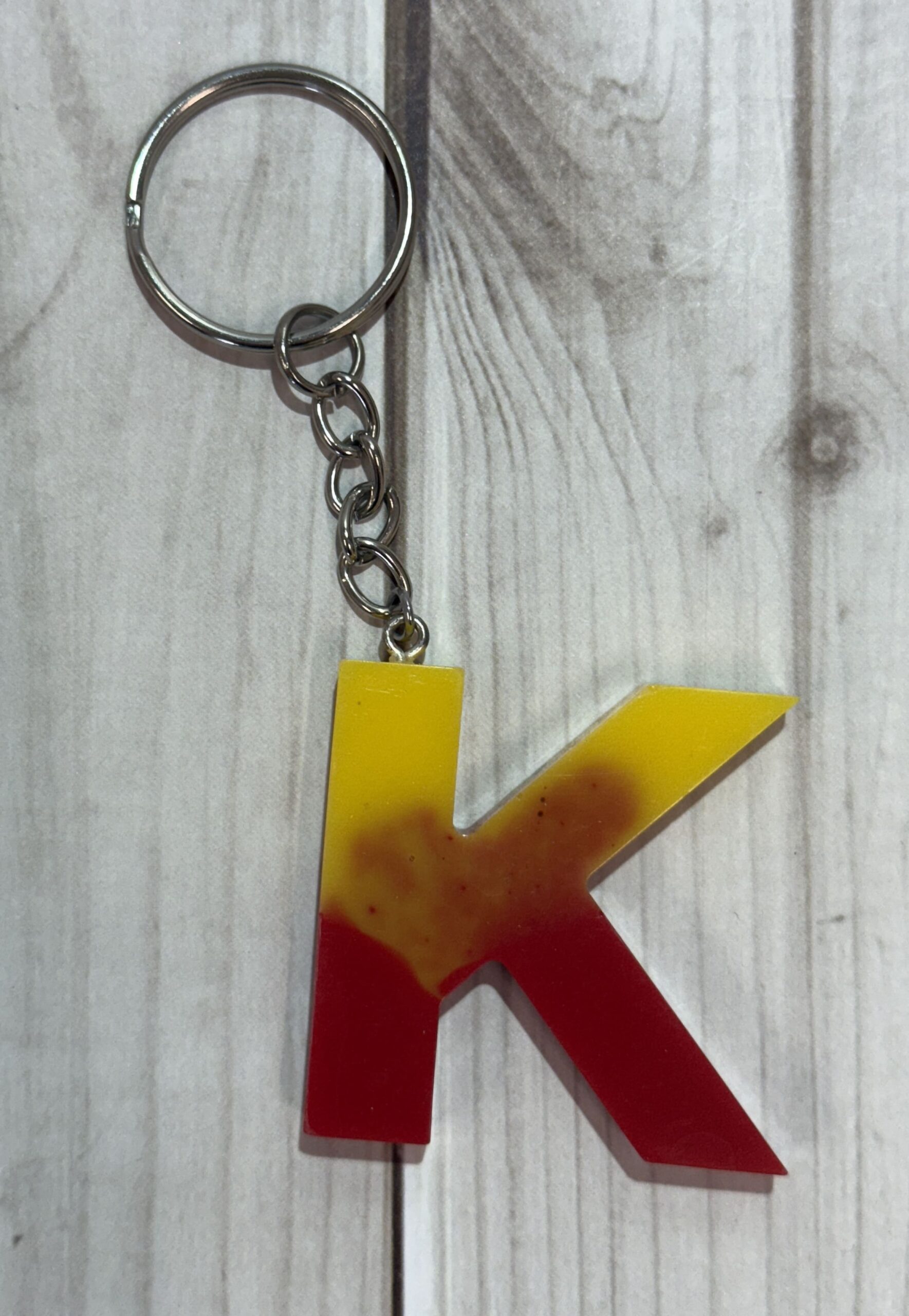 Ręcznie wykonany breloczek z żywicy epoksydowej w kształcie literki K. Góra w słonecznym żółtym, dół w intensywnym czerwonym – prosta, a zarazem pełna uroku dekoracja.