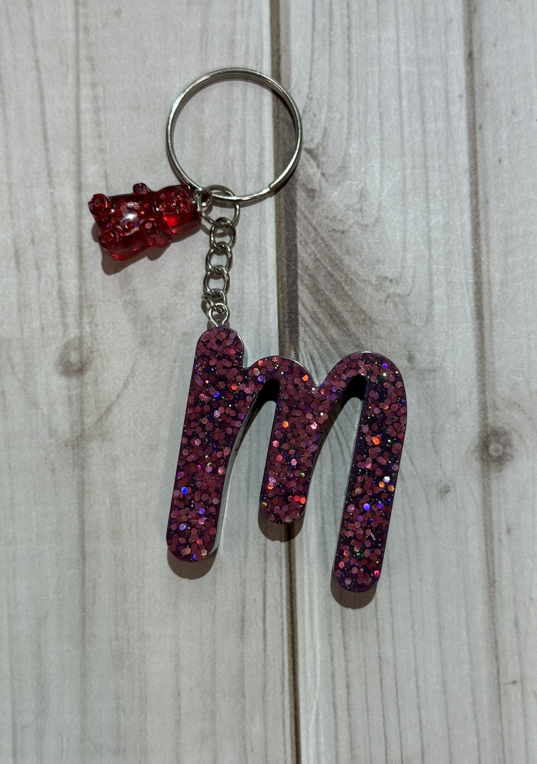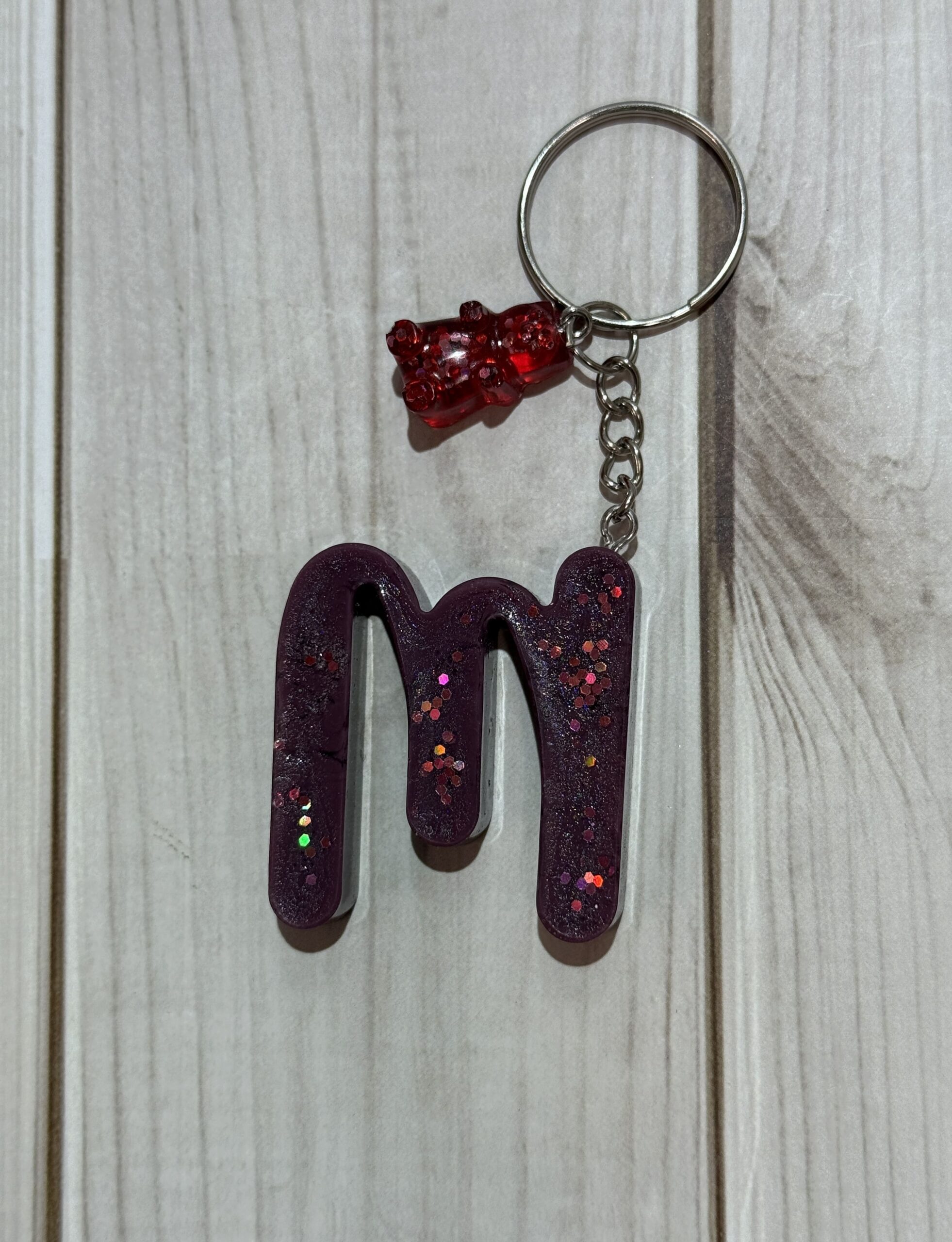 Ręcznie wykonany breloczek z żywicy epoksydowej w kształcie literki M, w śliwkowym fiolecie z holograficznym brokatem, który pięknie mieni się w świetle.
