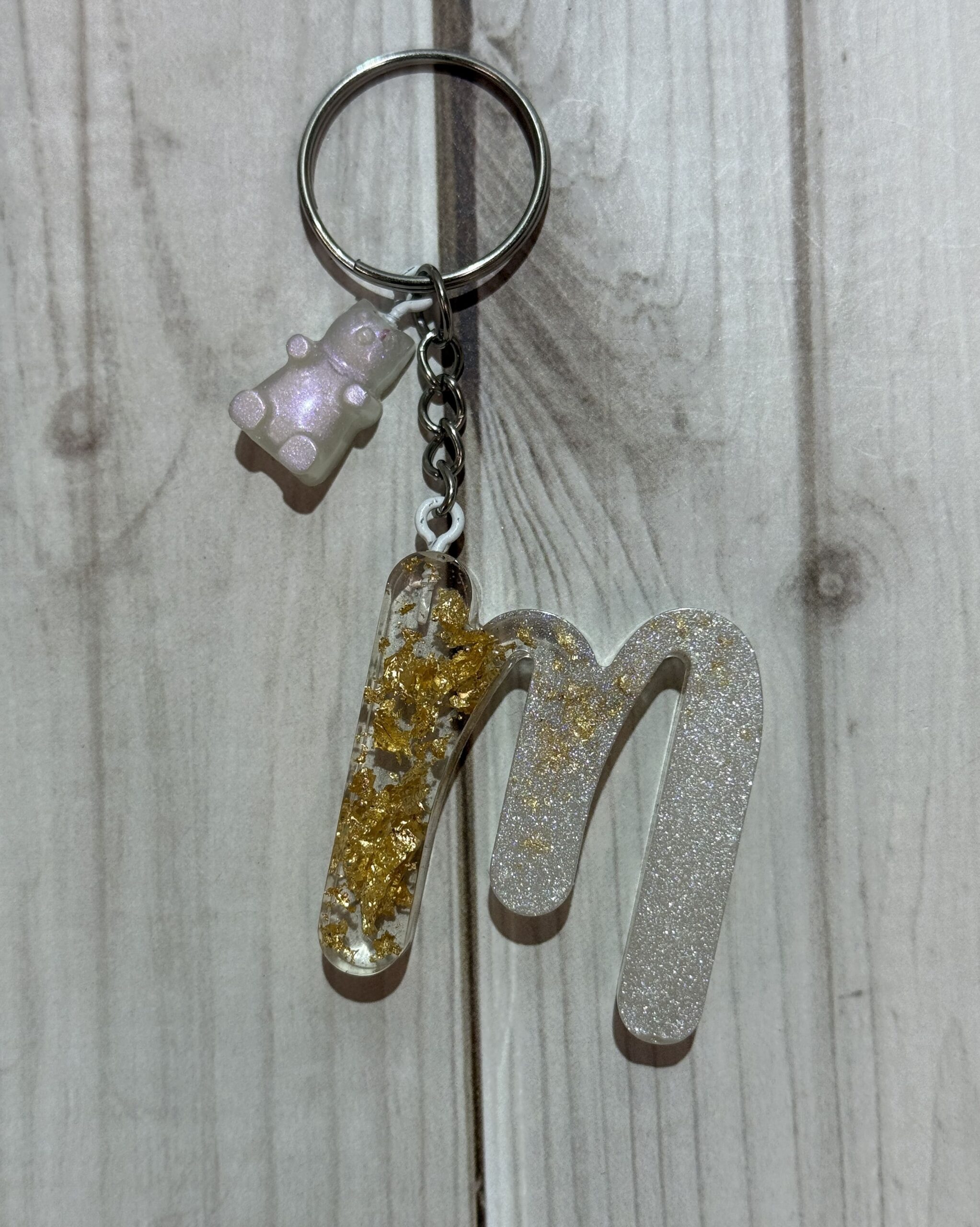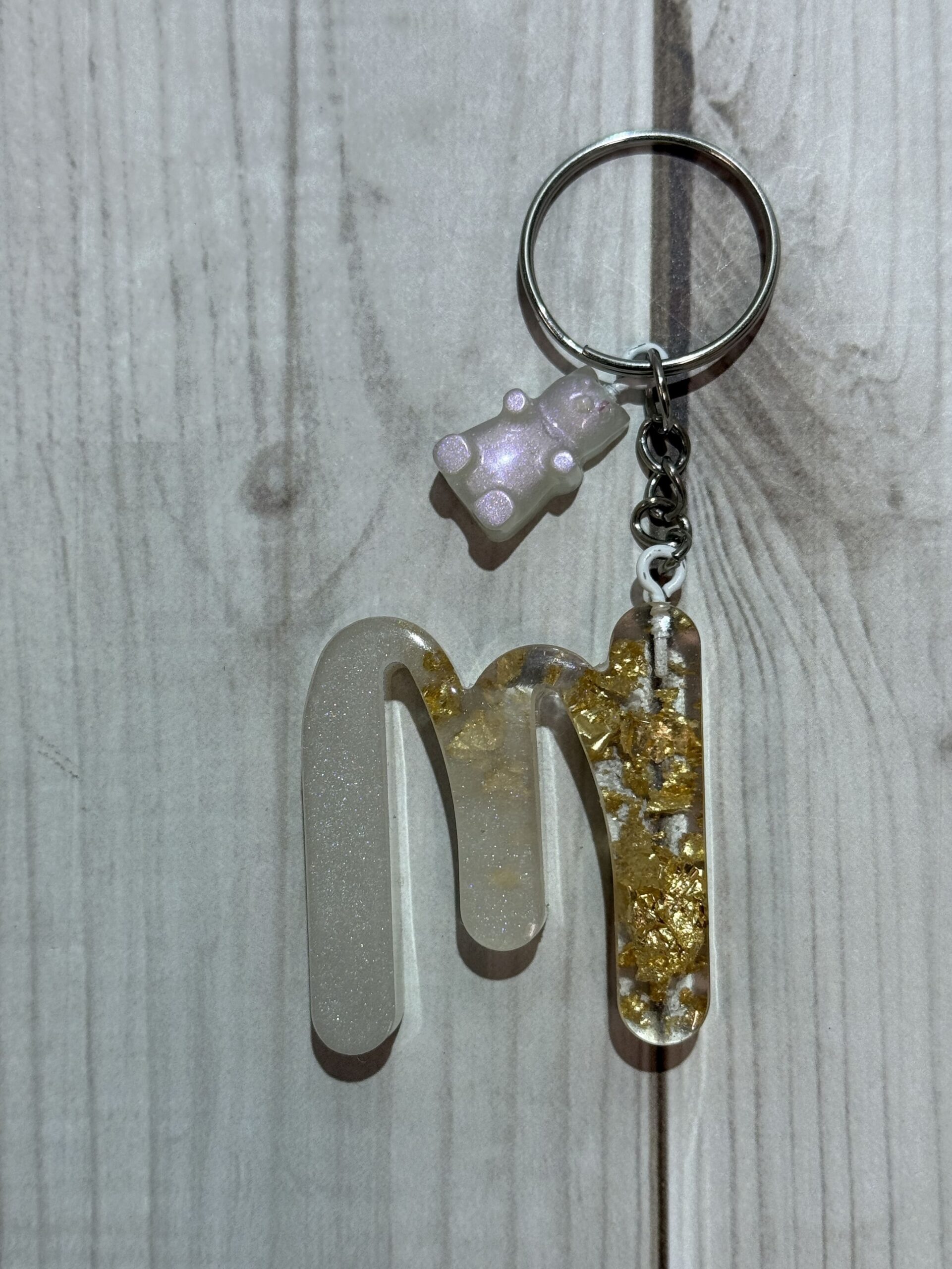 Ręcznie wykonany breloczek z żywicy epoksydowej w kształcie literki M, z jednej strony w białej perle, a z drugiej w transparentnej żywicy z delikatnymi płatkami złota, tworząc elegancki, luksusowy efekt.