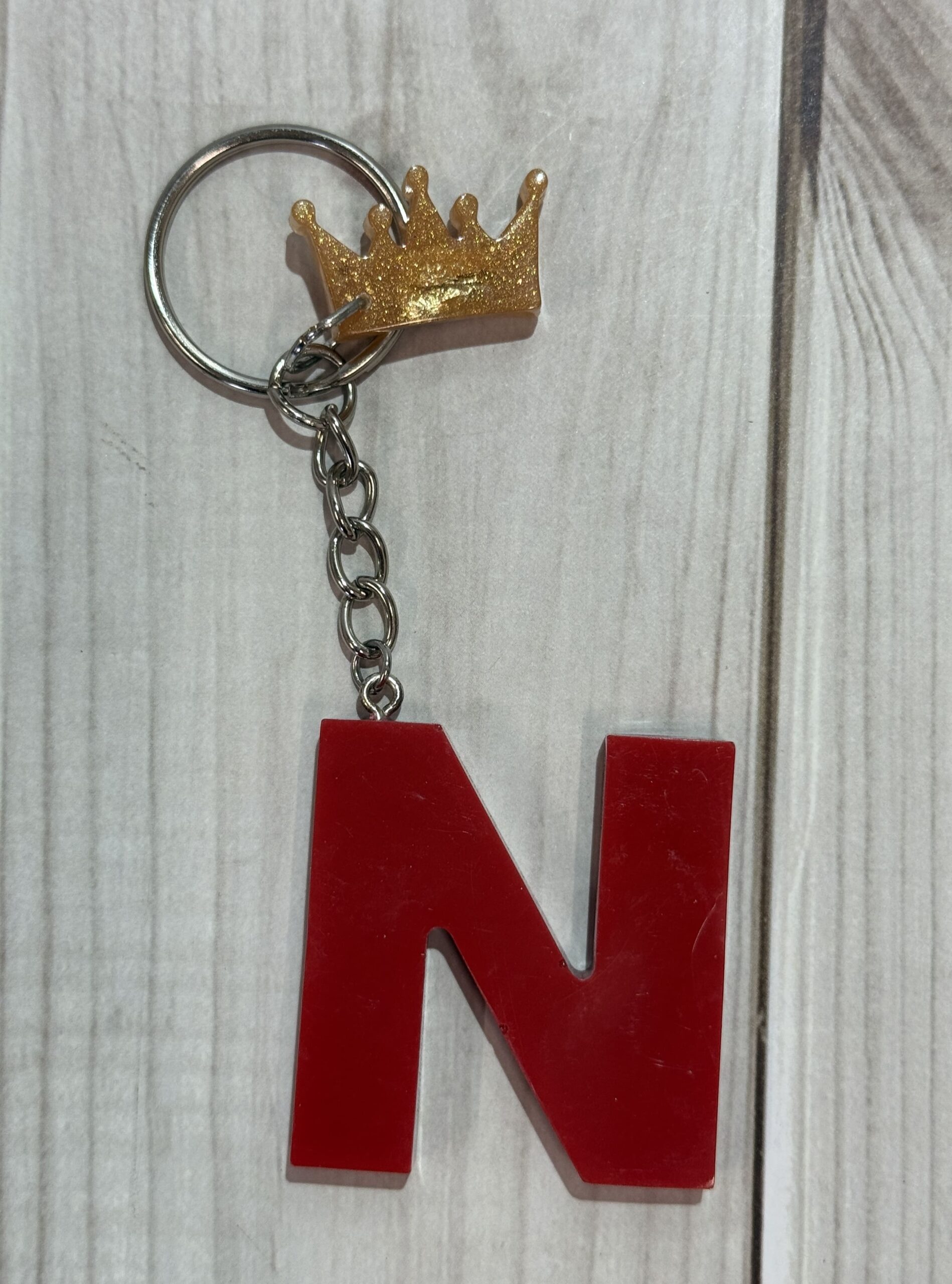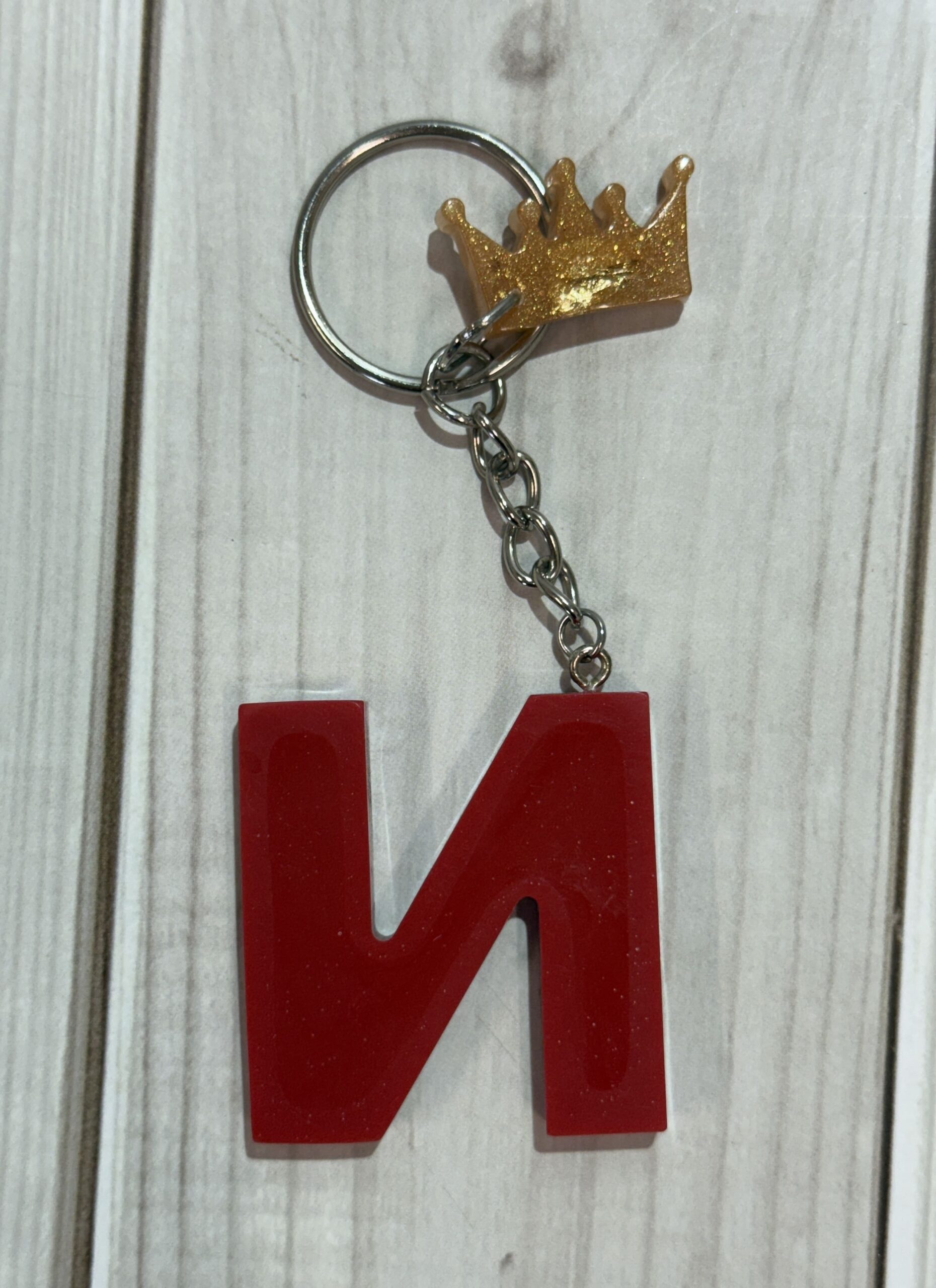 Ręcznie wykonany breloczek z żywicy epoksydowej w kształcie literki N, cała w intensywnej czerwieni, która przyciąga wzrok.