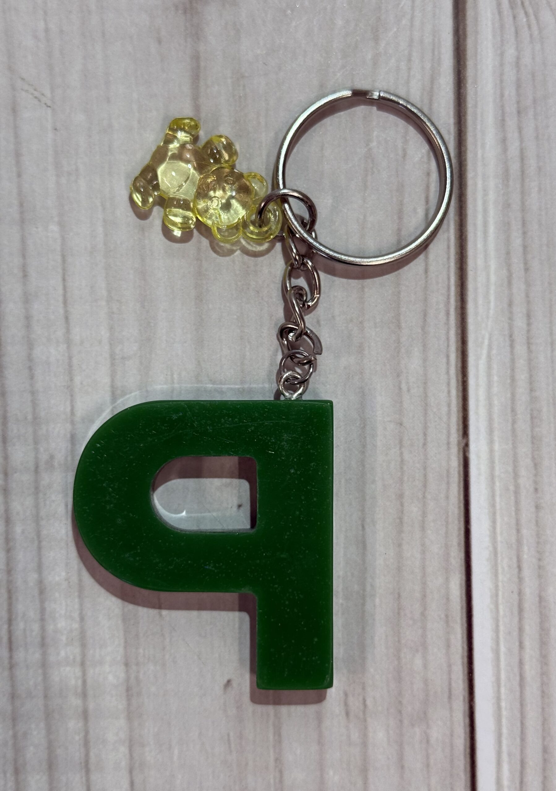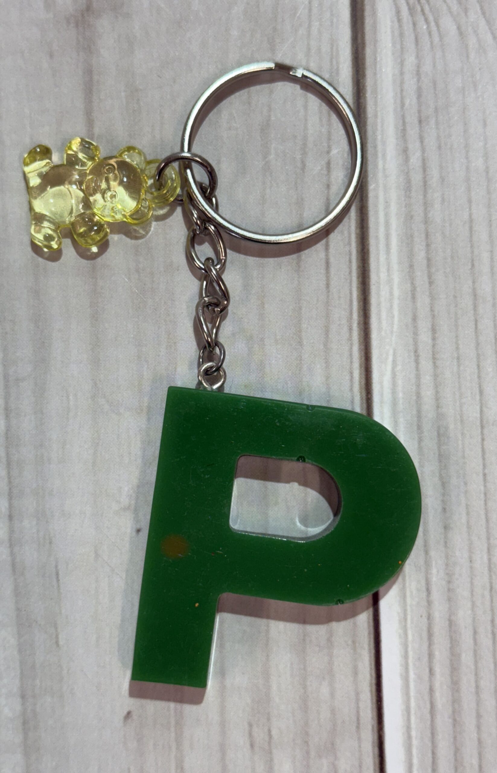 Ręcznie wykonany breloczek z żywicy epoksydowej w kształcie literki P, całkowicie w głębokiej zieleni, która przyciąga wzrok i kojarzy się ze świeżością natury.