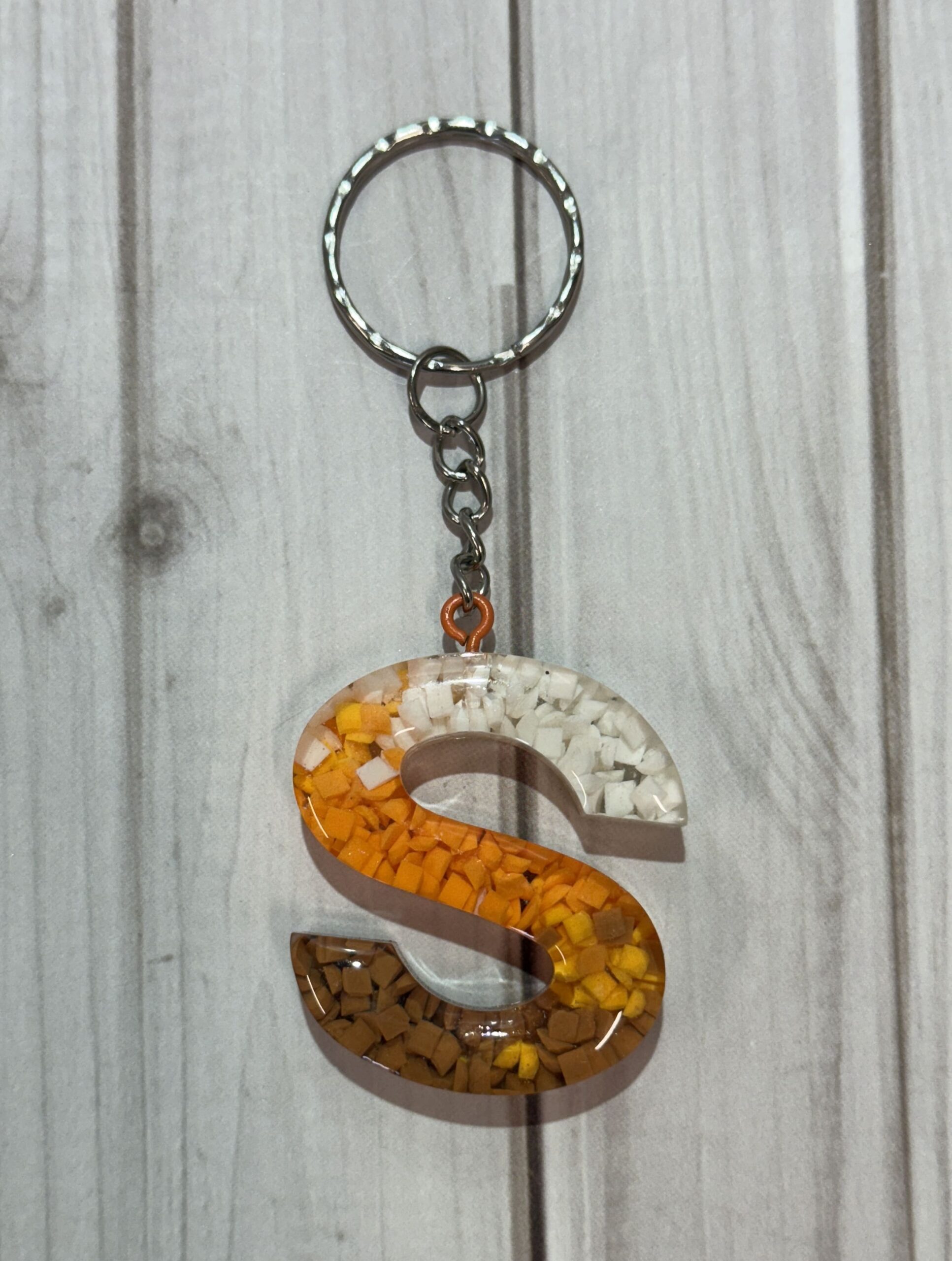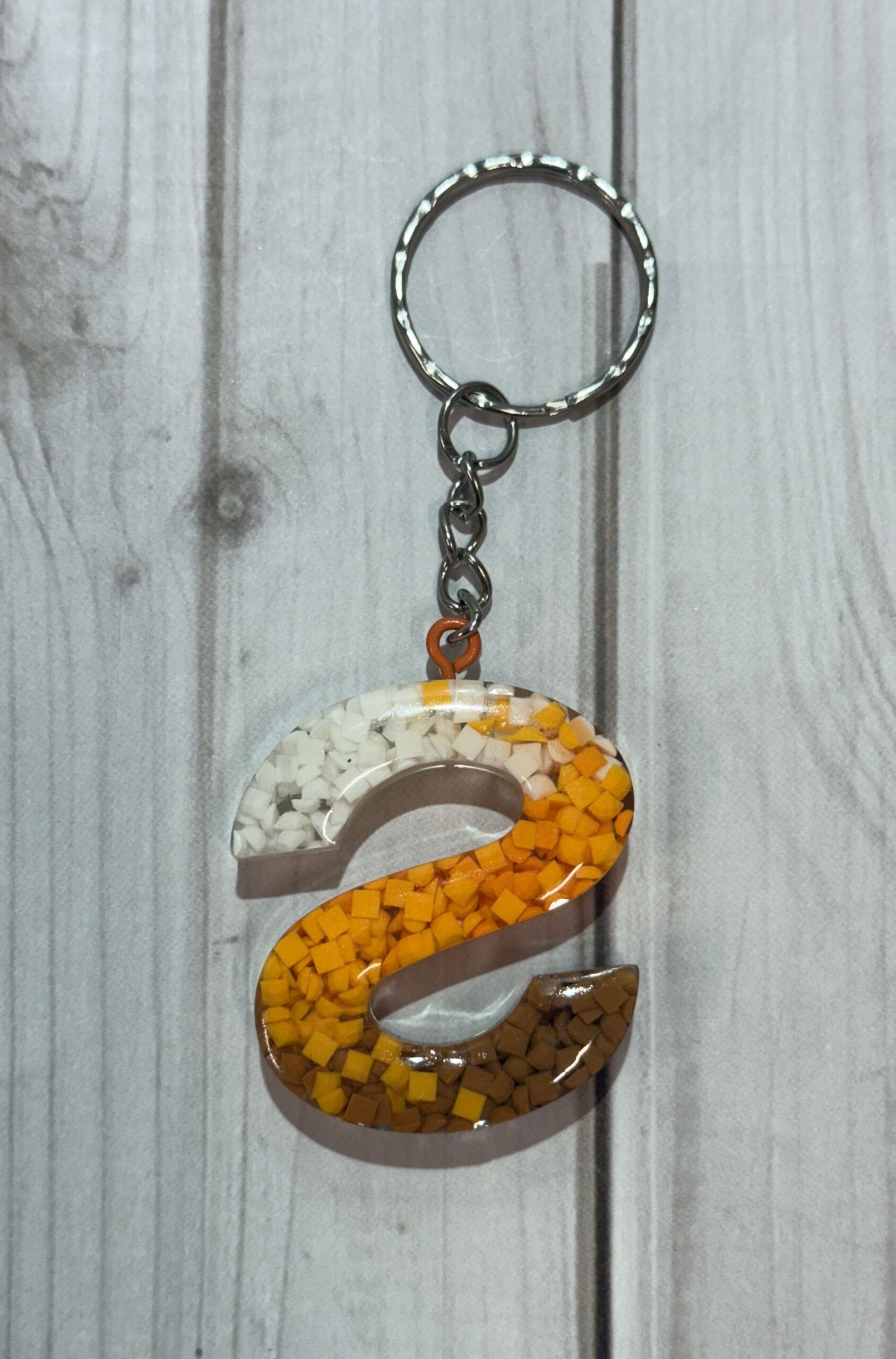 Ręcznie wykonany breloczek w kształcie literki S, stworzony z harmonijnej, kolorowej mozaiki: góra w odcieniu bieli, środek w energetycznym pomarańczu, a dół w delikatnym kremie. Połączenie tych trzech barw tworzy lekką, radosną kompozycję, która przyciąga wzrok subtelnym urokiem.