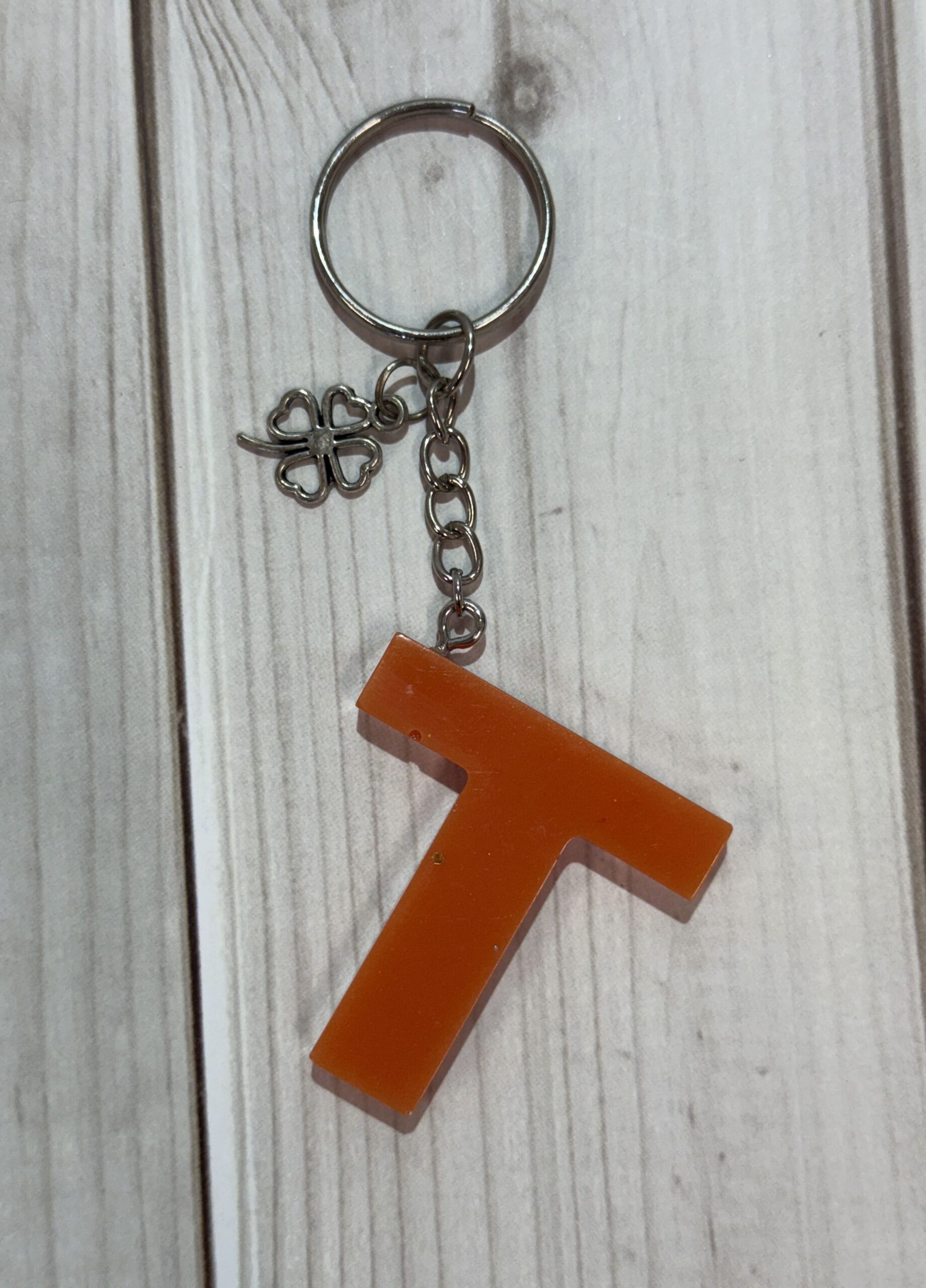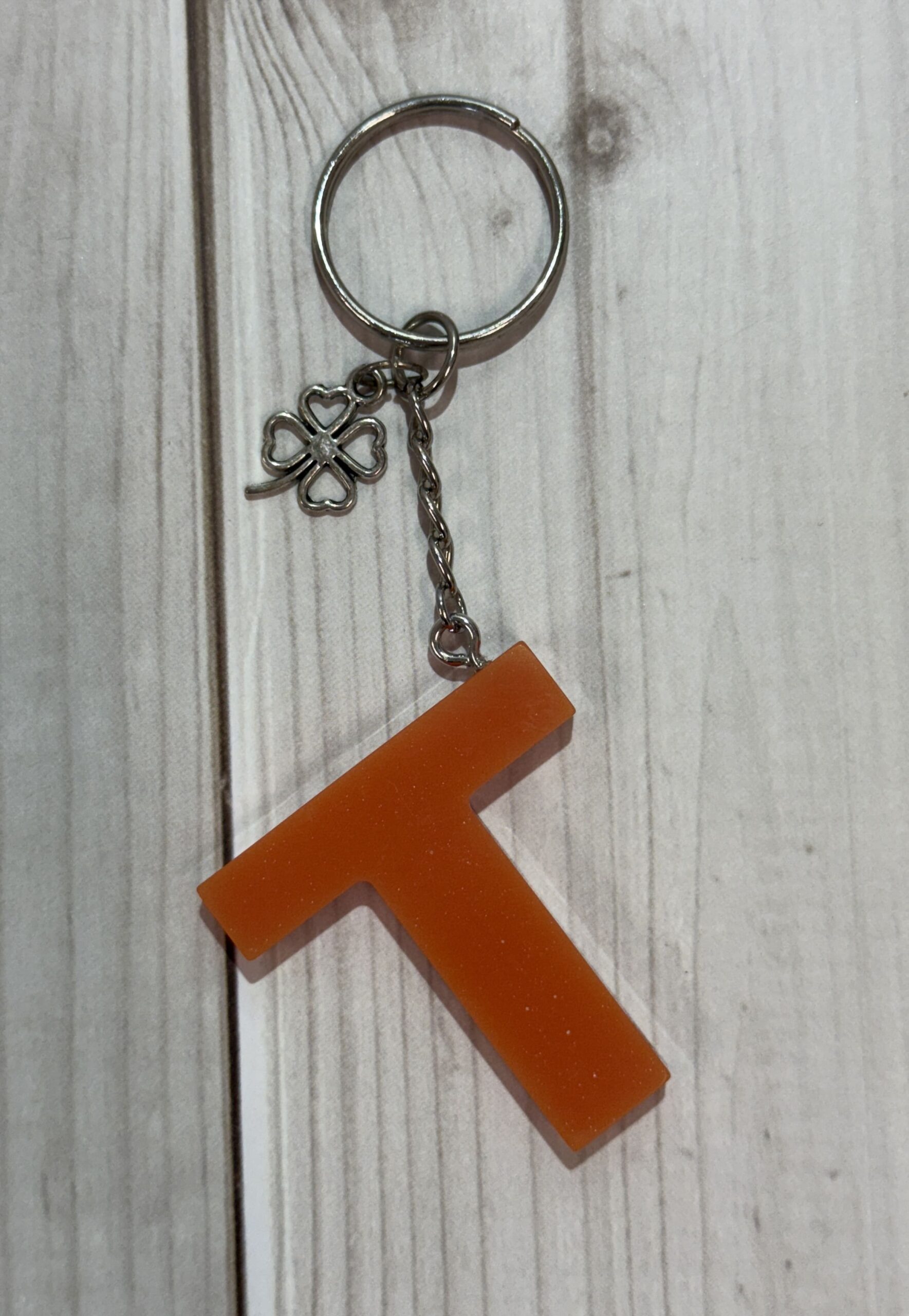 Ręcznie wykonany breloczek w kształcie literki T, w intensywnym pomarańczowym kolorze, nadającym literce radosny i energetyczny charakter.