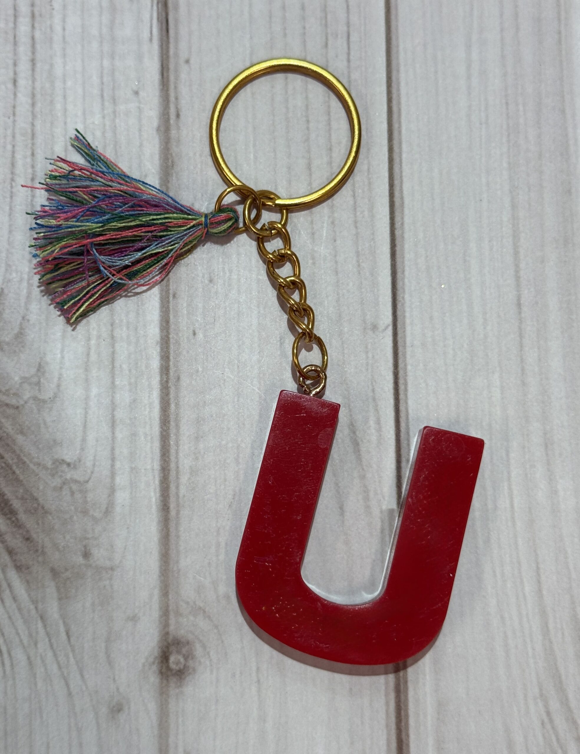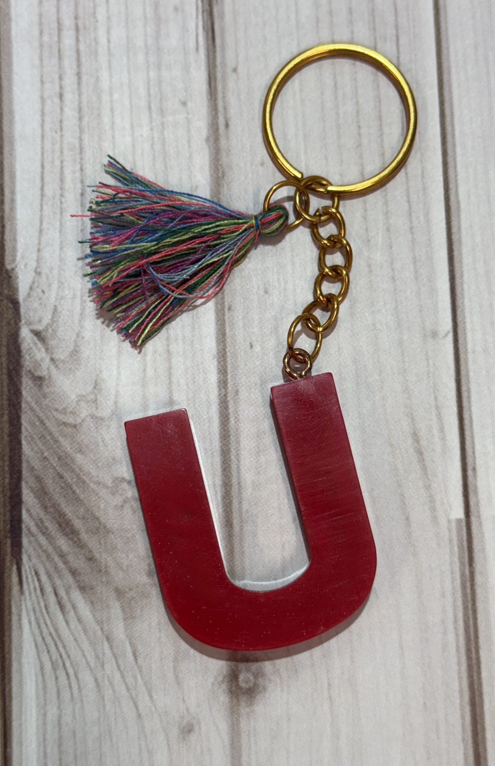 Ręcznie wykonany breloczek w kształcie literki U, całkowicie w intensywnej czerwieni, przyciągającej wzrok i nadającej literce energetycznego charakteru.