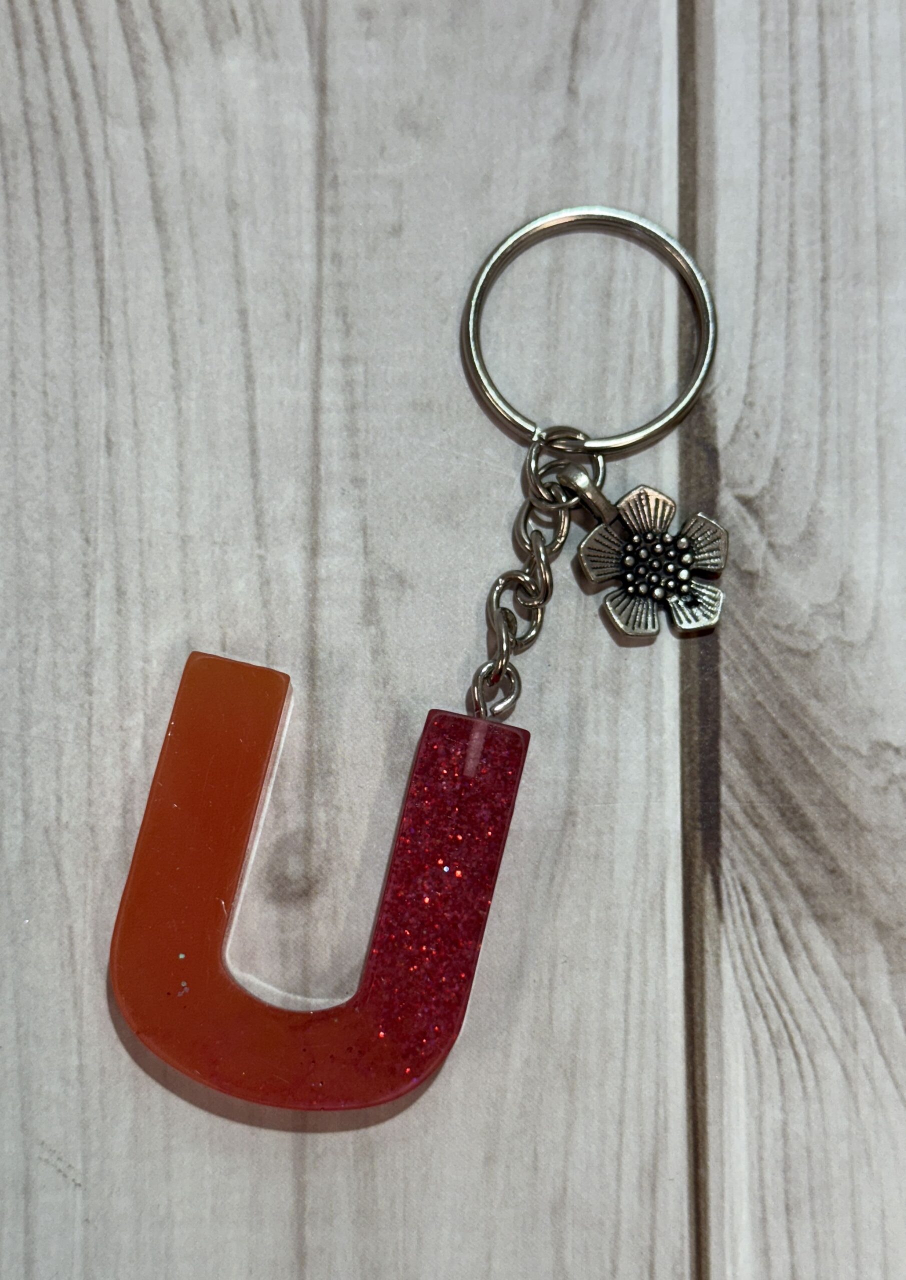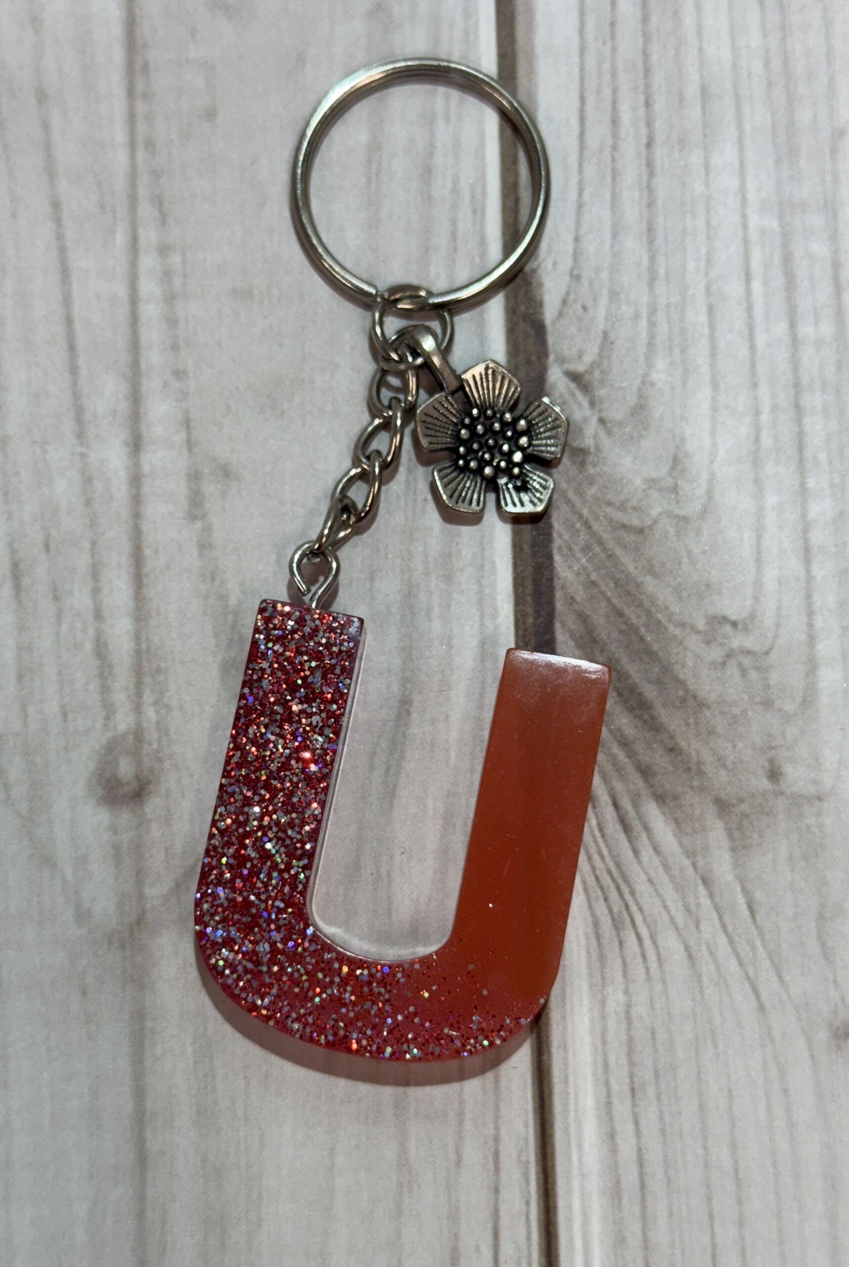 Ręcznie wykonany breloczek w kształcie literki U, w pastelowym pomarańczowym odcieniu z jednej strony oraz różowym brokatem z drugiej, tworząc subtelny, słodki efekt przejścia kolorów.
