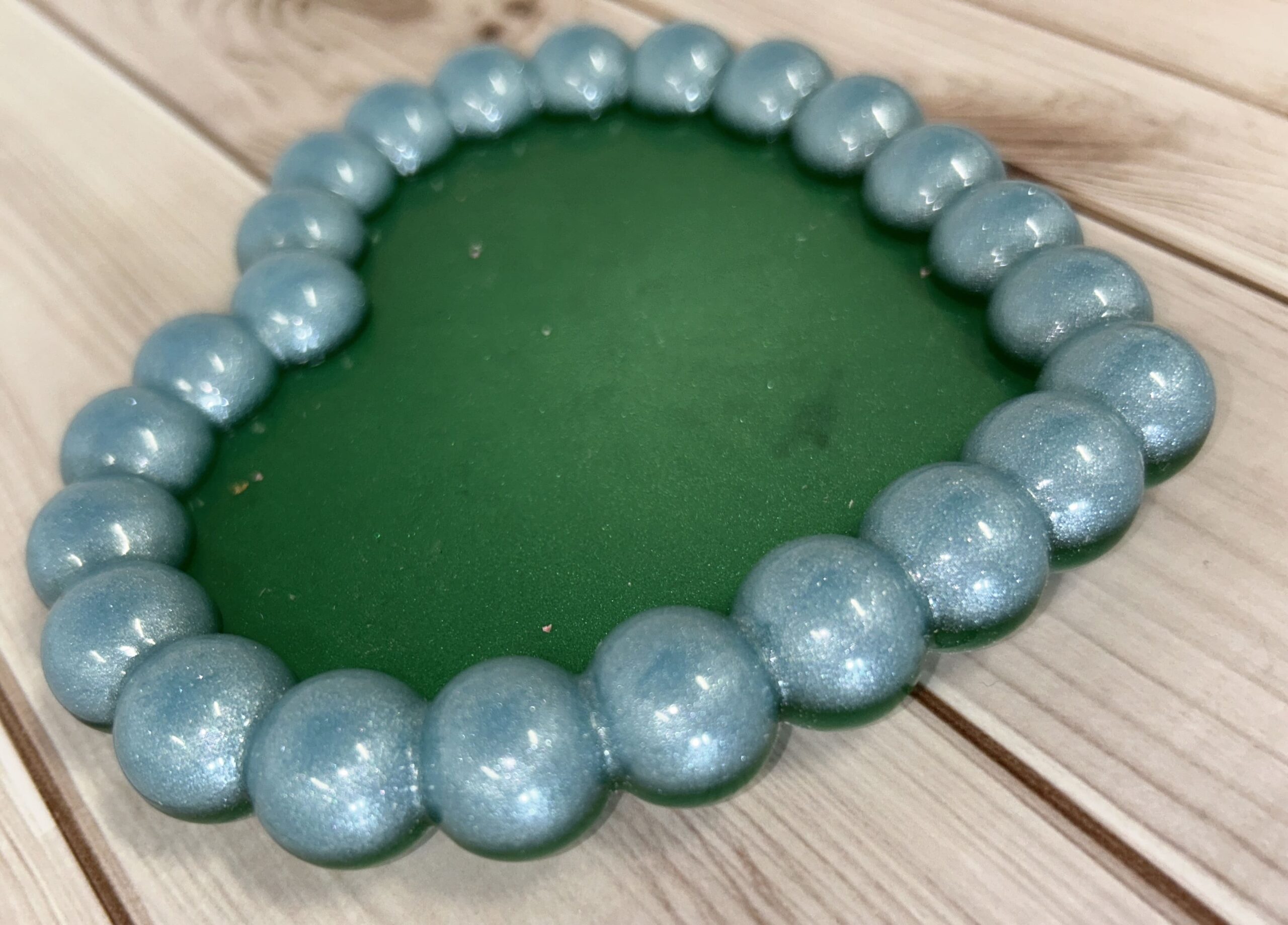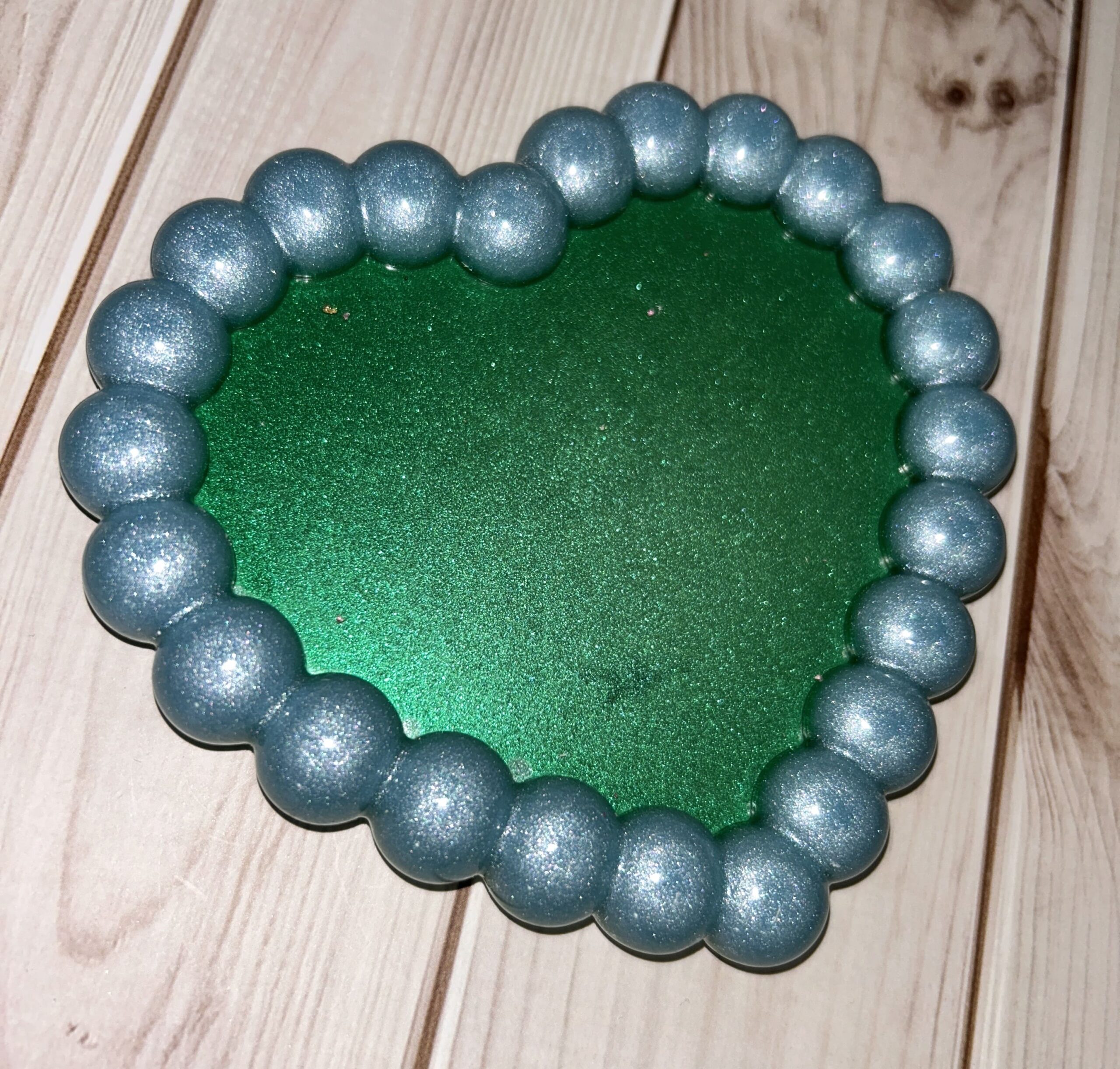 Podstawka ozdobna w kształcie serca na biżuterie, klucze lub inne drobiazgi. Wykonana całkowicie z żywicy epoksydowej z perłowej tonacji, brzegi jasnoniebieskie, a środek zielony.