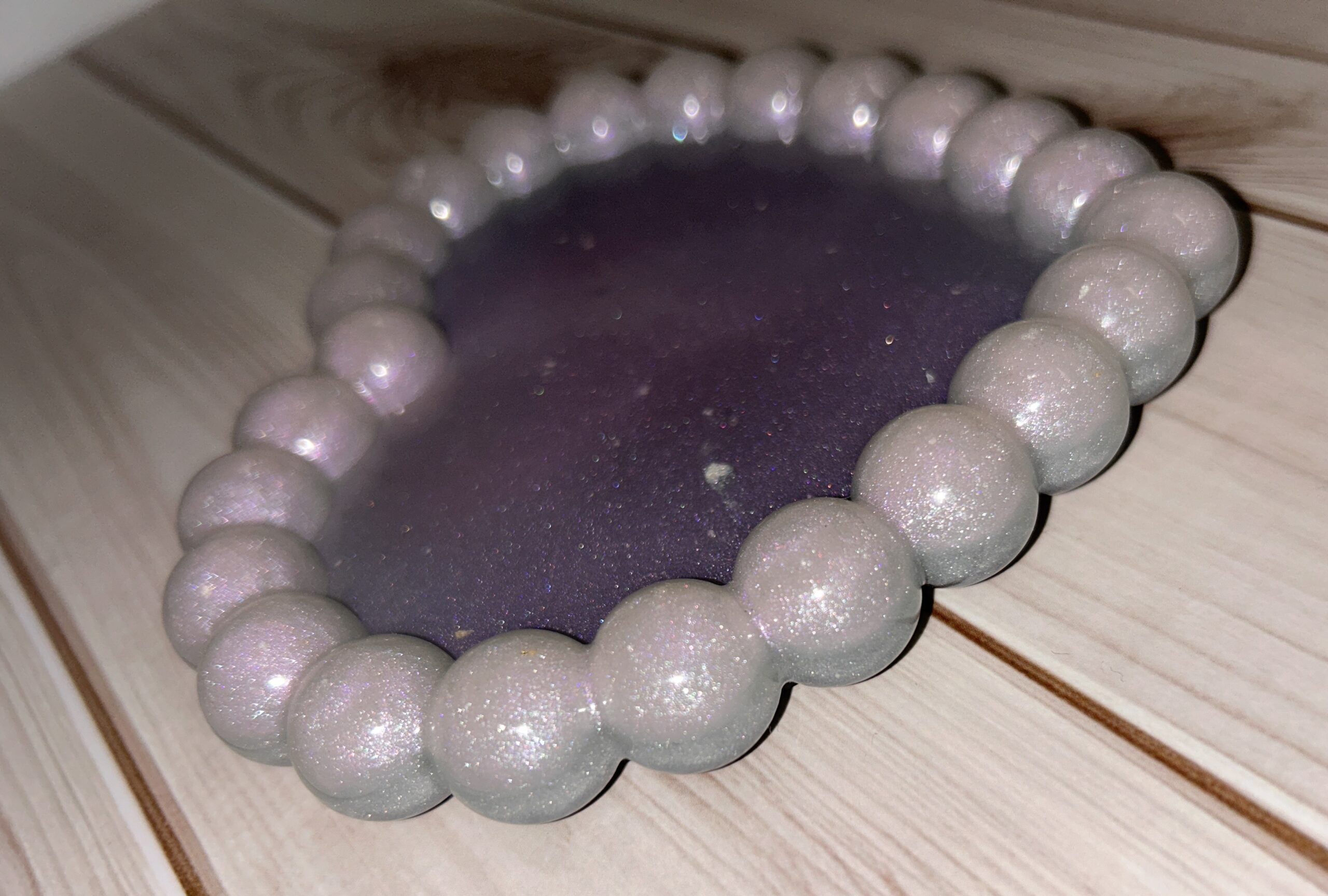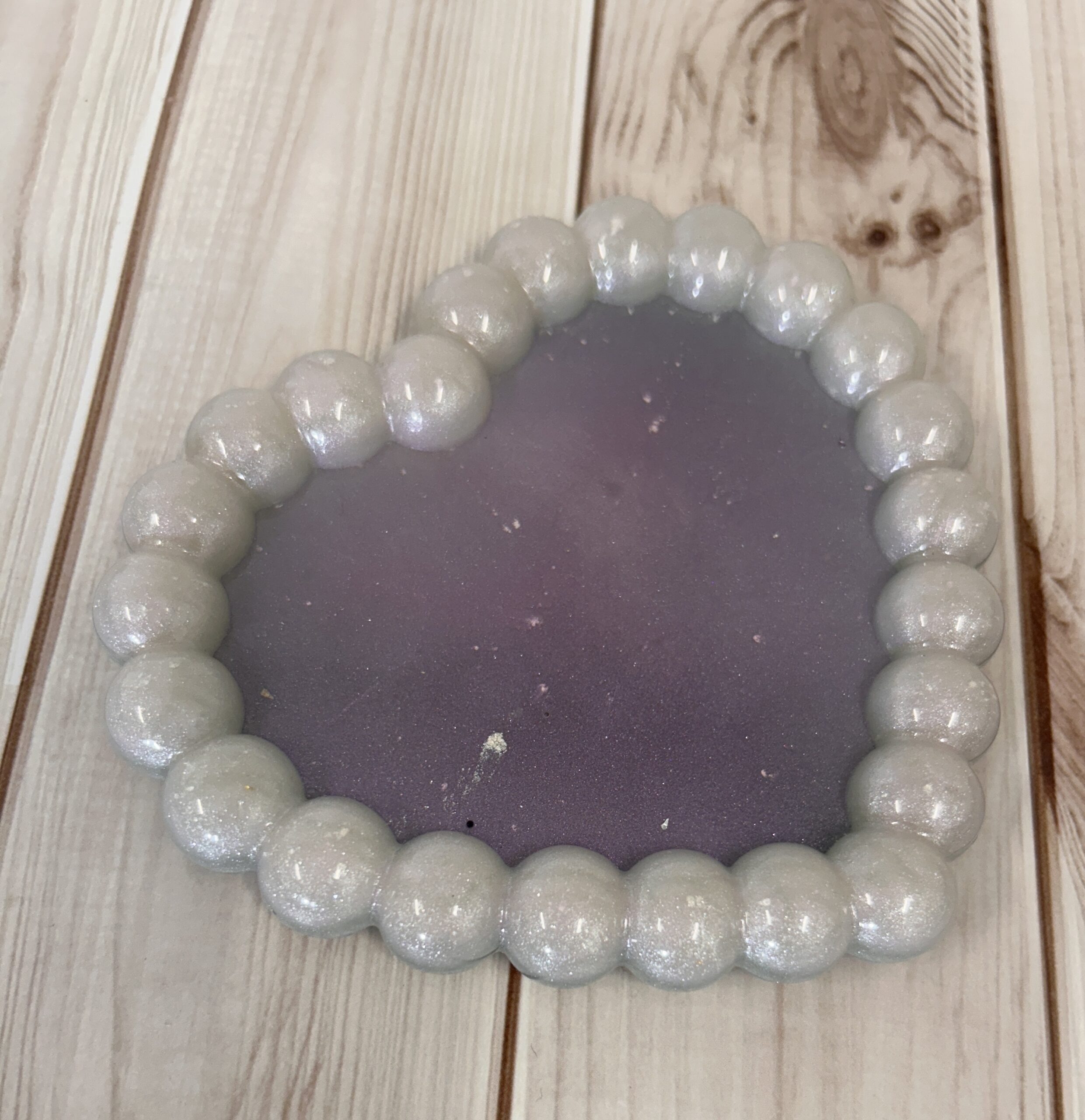 Podstawka ozdobna w kształcie serca wykonana całkowicie z żywicy epoksydowej w jasnych kolorach perłowych z czarnym tłem.