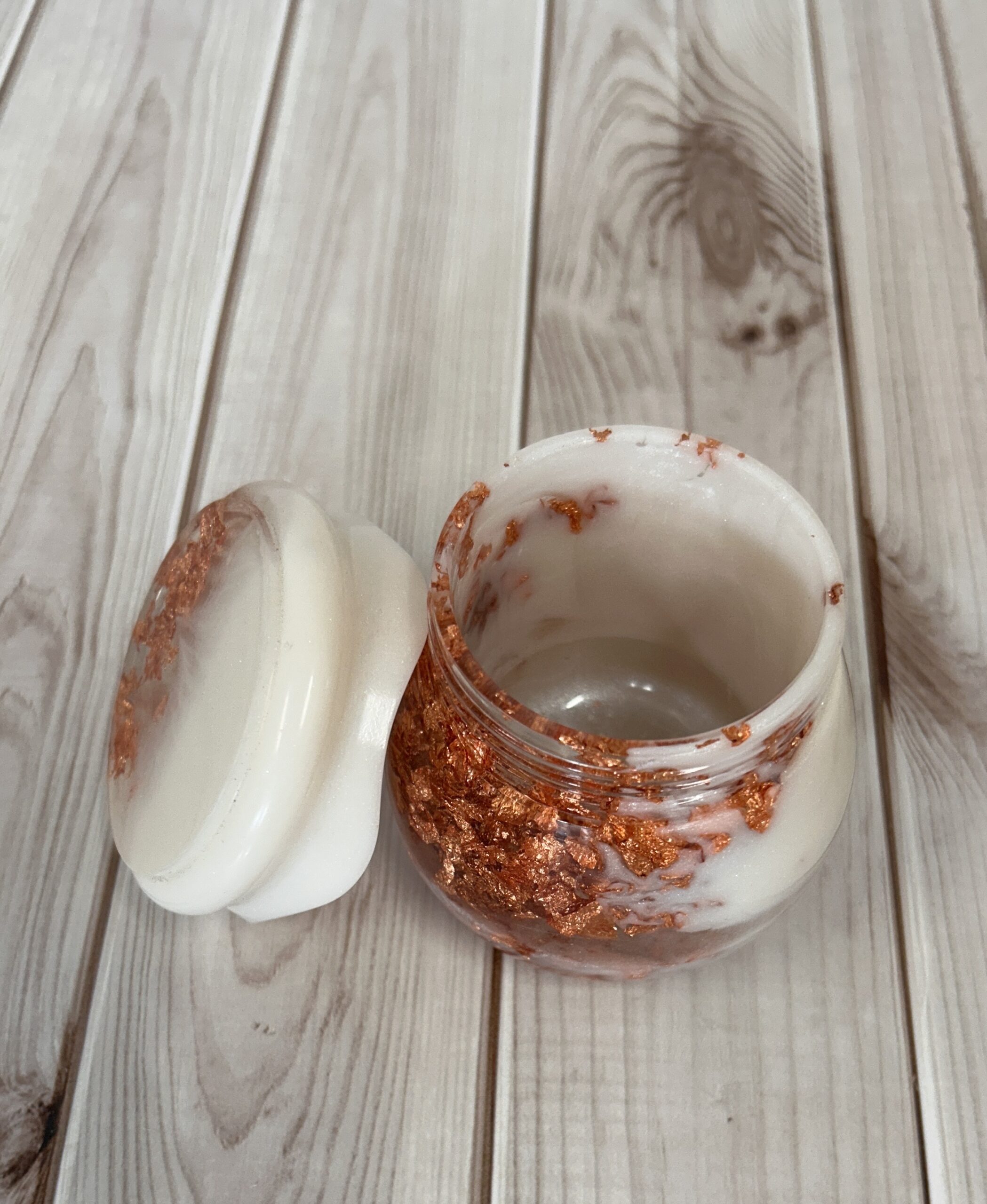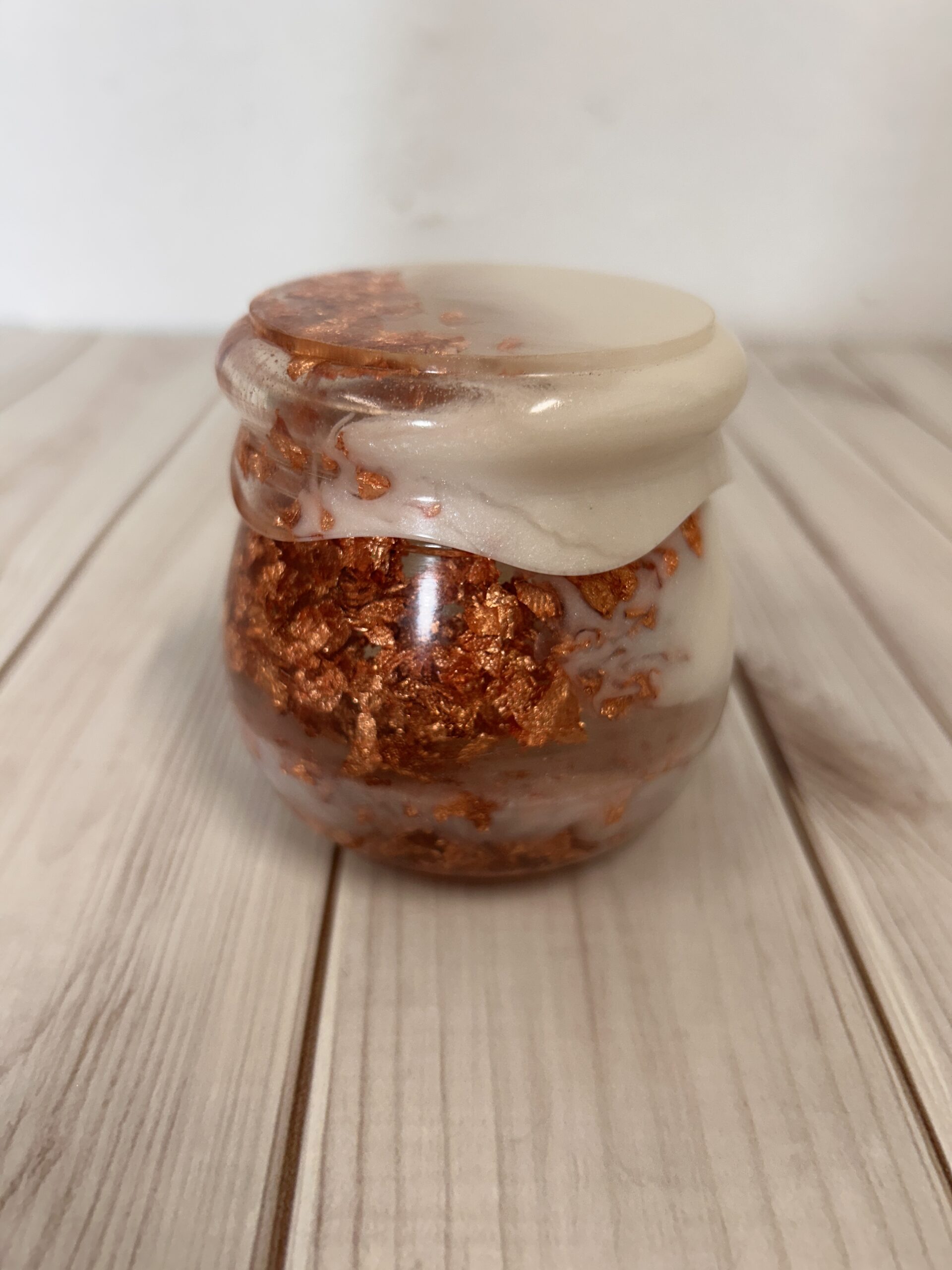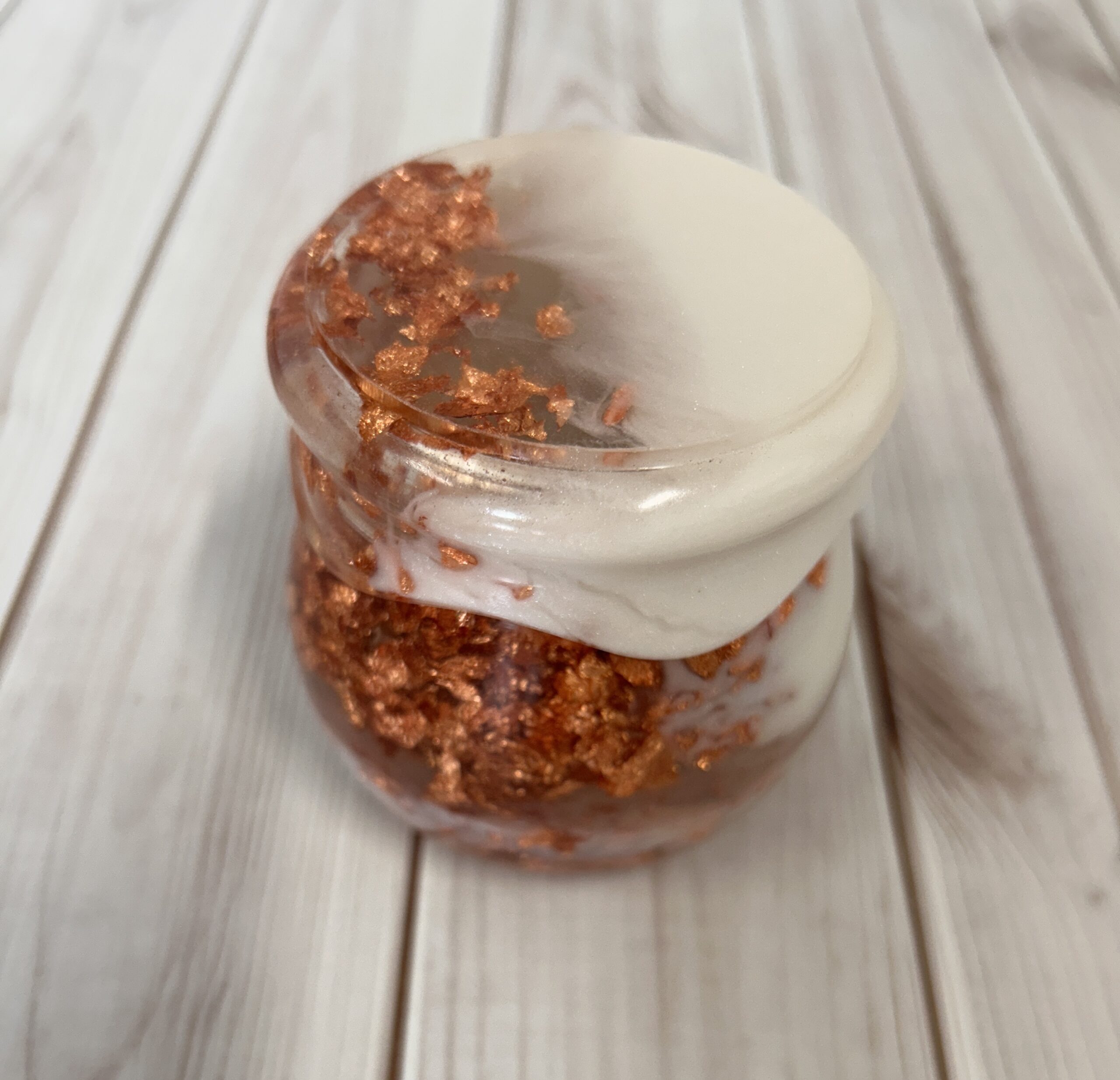 Słoiczek na drobiazgi całkowicie wykonany z żywicy epoksydowej w kolorze białej perły z płatkami różowego złota.