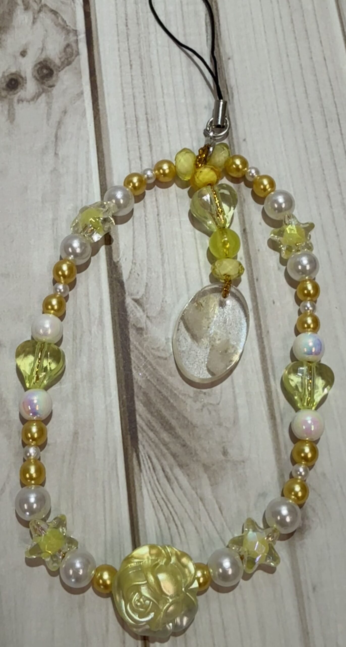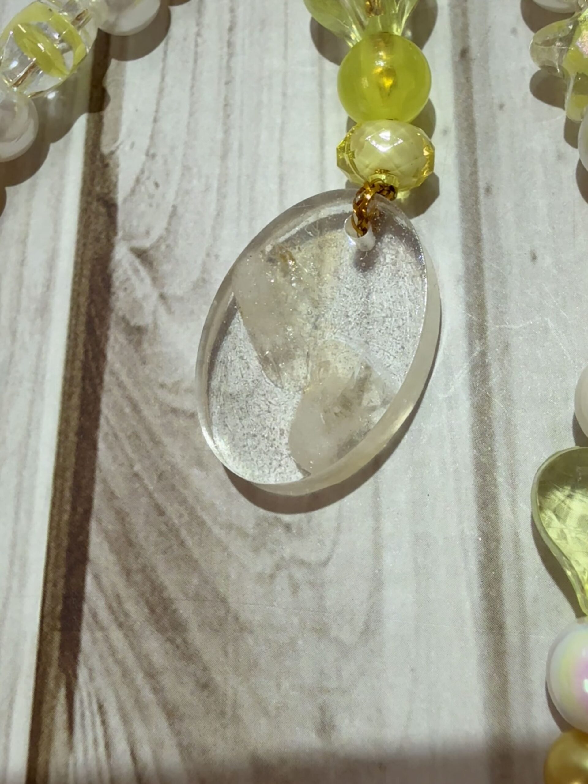 Smycz do telefonu z koralików akrylowych i szklanych z zawieszką z żywicy epoksydowej. W zawieszce zatopione są naturalne kamienie – cytryn, który jest kamieniem radości, szczęścia i energii.