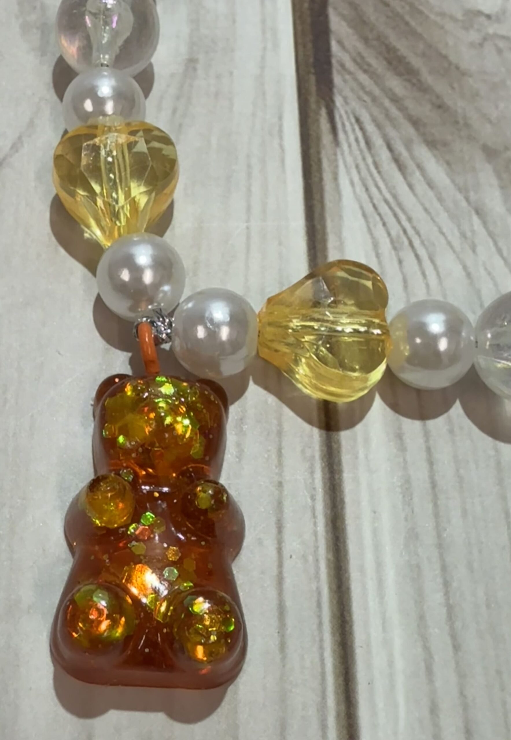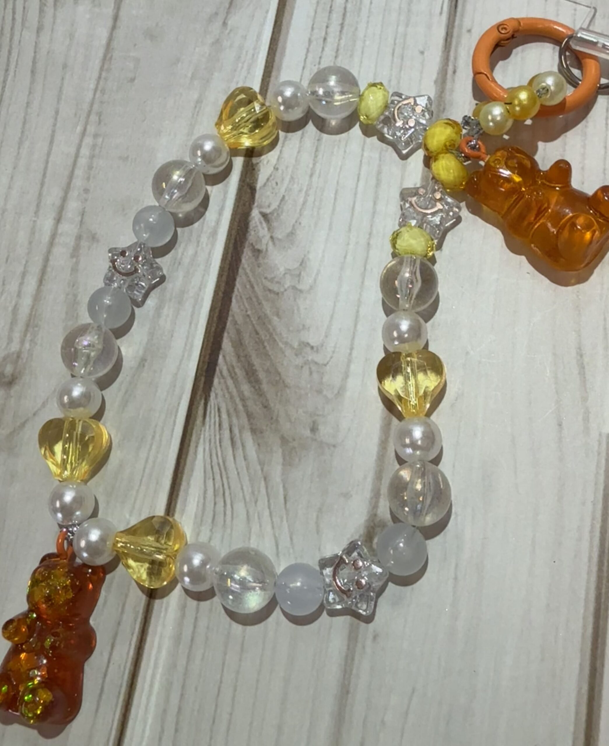 Smycz do telefonu z koralików akrylowych oraz misiami z żywicy epoksydowej, jeden miś zdobiony brokatem świecącym w ciemności.