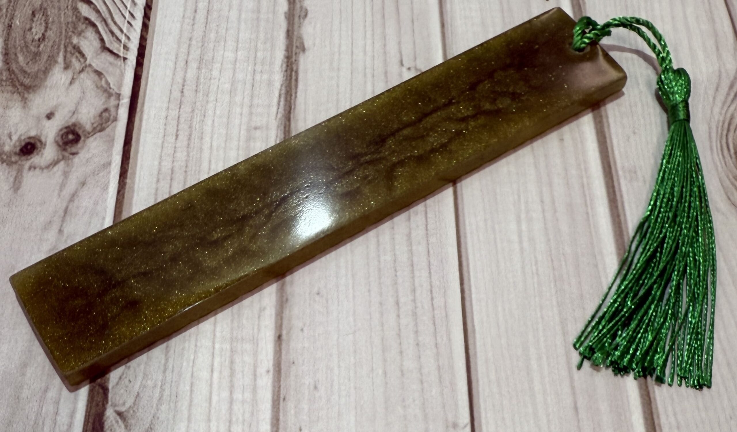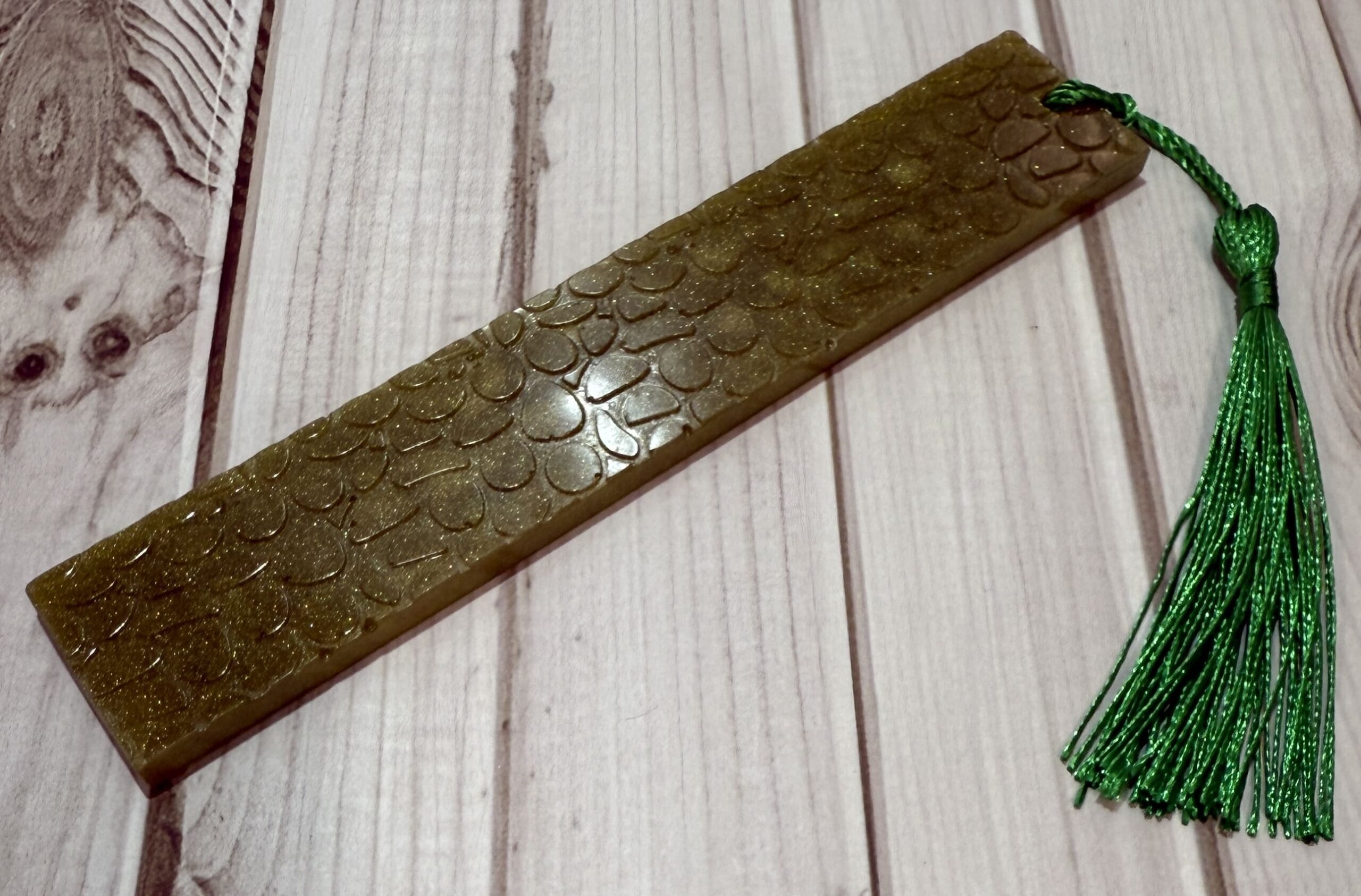 Zakładka do książki wykonana z żywicy epoksydowej z zielonym chwostem. Cała zakładka zachowana w tonacji zielonej perły, a tłoczone wzory dodają uroku zakładce.