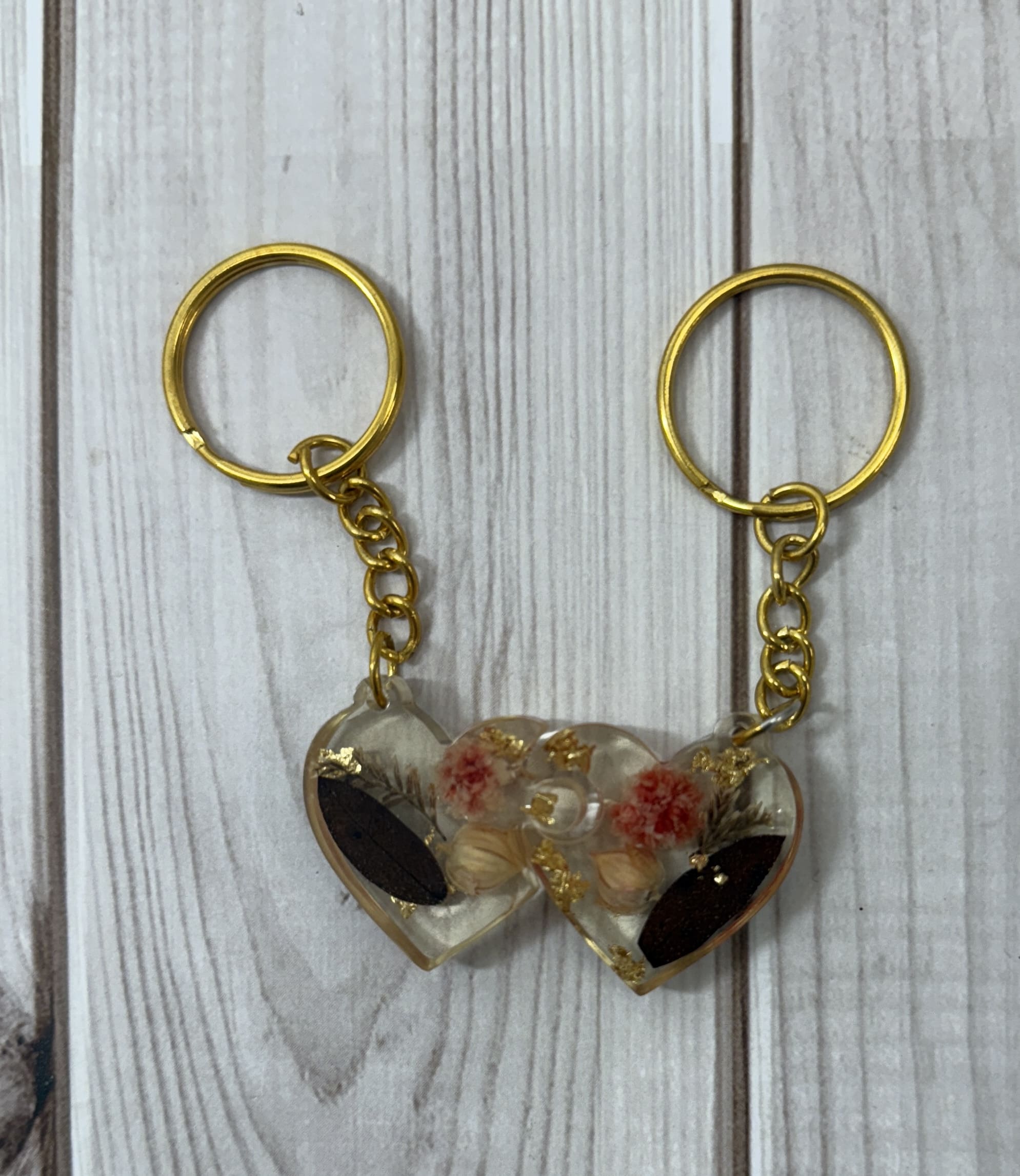 Przepiękny zestaw dwóch breloczków w kształcie połówek serca, które po złączeniu tworzą jedną całość. Wykonane z krystalicznej żywicy, wewnątrz której zatopione zostały delikatne suszone kwiatuszki w odcieniach różu i kremu, drobne listeczki oraz eleganckie płatki złota nadające całości subtelnego, luksusowego blasku.